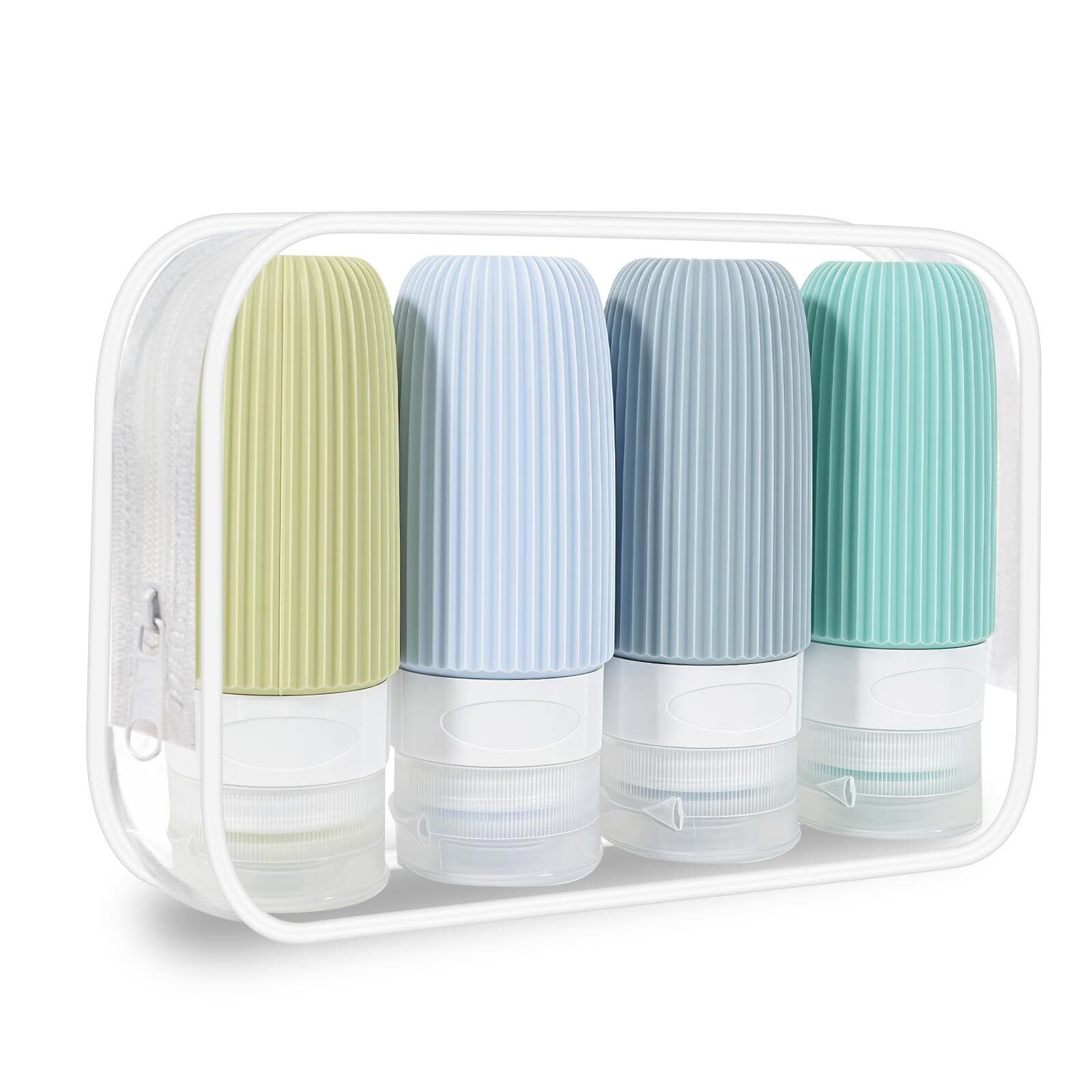 【TSA機内持ち込み対応】 2oz(60ml)のシリコン製トラベルボトル4本セット。シャンプー、コンディショナー、ボディソープ、ローション、ハンドサニタイザーなどに最適です。高品質な透明ジッパー付きポーチが付属し、省スペースで持ち運びに便利。