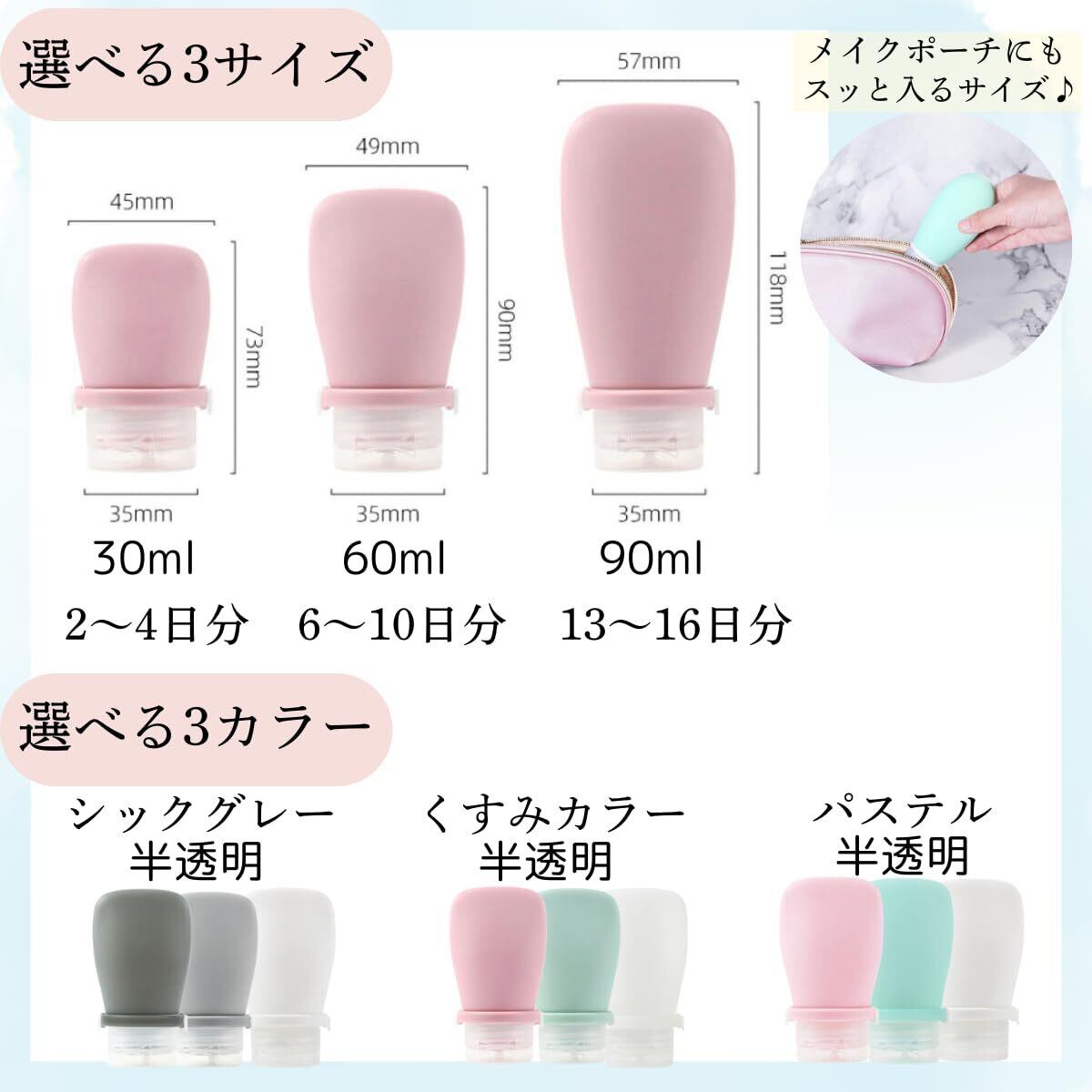 【どなたでも使いやすいオシャレなデザイン・カラー・サイズ】 ご家族で 恋人と お一人で いろんな方にお使いいただきたく3カラー・3サイズご用意しました。シックなグレー系、可愛いパステル、トレンドのくすみカラー。サイズも90ml/60ml30mlと旅行から銭湯セット・ジムやプールなど用途によってお選びいただけます。