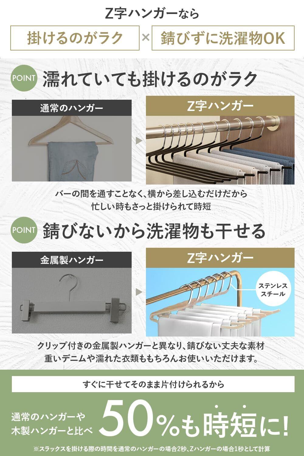 【省スペース設計で収納効率アップ】 厚さわずか0.5cmのスリム設計で、クローゼットの収納力を大幅に向上。Z字型のオープン設計により、ハンガーを掛けたままサッとズボンやスラックスを差し込むだけ。通し入れ不要で、朝の準備もスピーディに!複数本を並べてもかさばらず、ボトムスハンガーとして抜群の効率性を発揮します。
