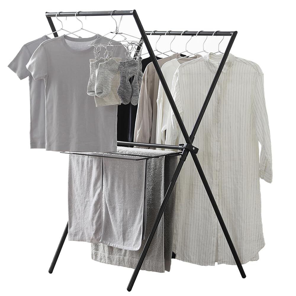 \【◆アイリスオーヤマ 洗濯物干し 物干しスタンド 室内物干し ブラック X型 使わないときはコンパクトに畳める 簡単組立 インテリア性にこだわった 布団もカラっと乾かせる 着脱可能なタオルハンガー付き 幅約76×奥行約62×高さ約130 シンプル 一人暮らし 家族 ラック STMX-770!】/