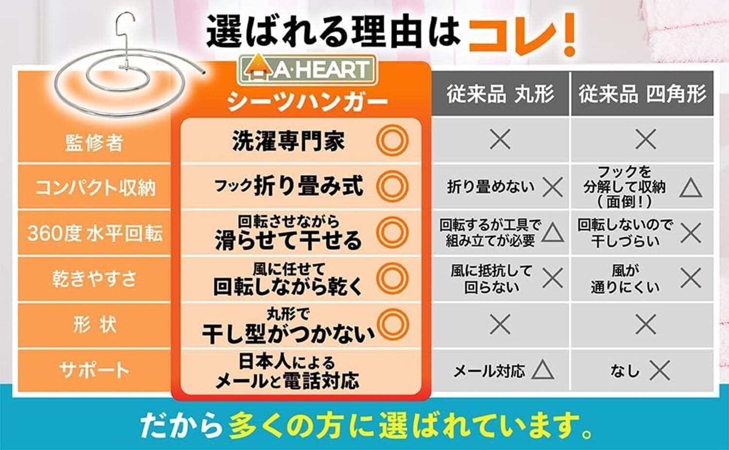 【丸型がおすすめ理由】 丸型で回転するのでスルスル回しながら干すことができ、取り込みもスムーズです。さらに、適度に間隔空いた、らせん状のため風の通りがスムーズで乾きやすいです。四角型と違って干し型が付く心配もありません。では丸型を洗濯専門家監修のもと商品開発いたしました。