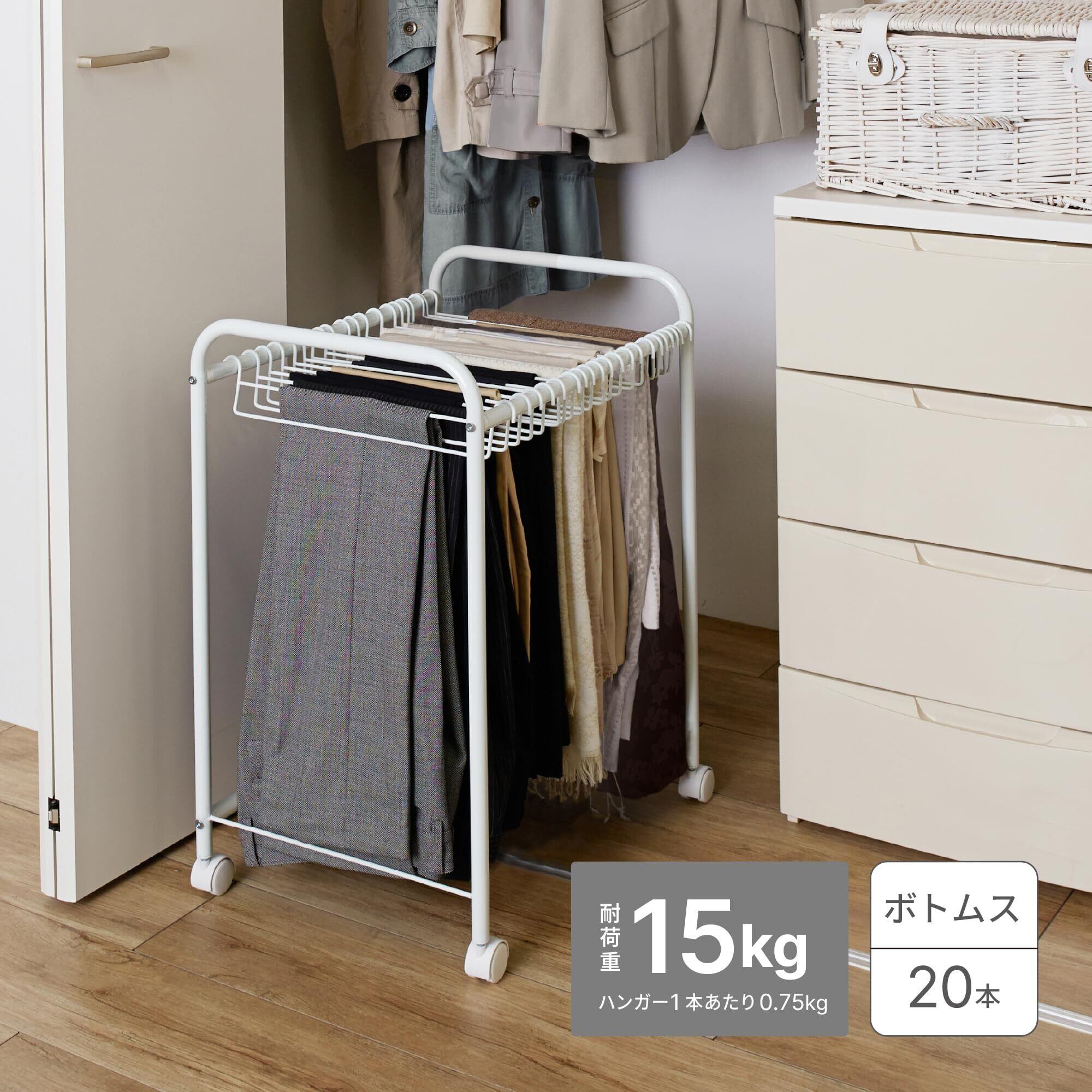 横幅43cmのコンパクトサイズで、最大20着までのズボンやスラックスを収納できる、便利なボトムスハンガー。