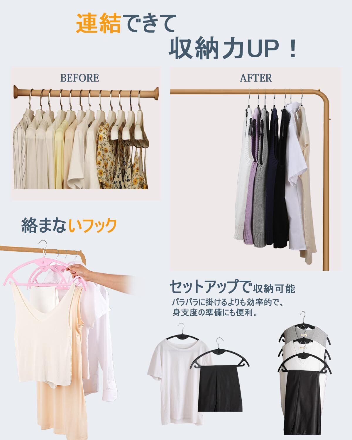 【実用性があるデザイン】タテ方向に連結できるので、ハンガーの上部に連結フックが付いており、複数のハンガーを簡単に連結できます。クローゼットをすっきり整理し、スペースを最大限に活用できます。