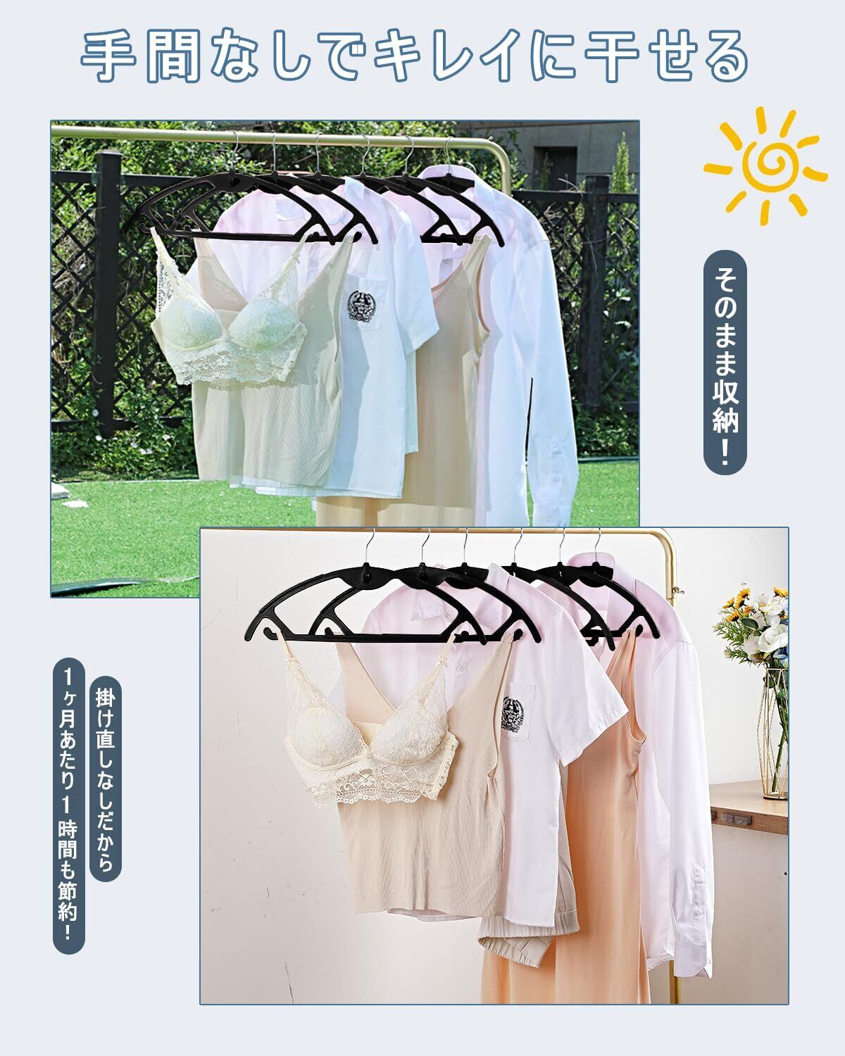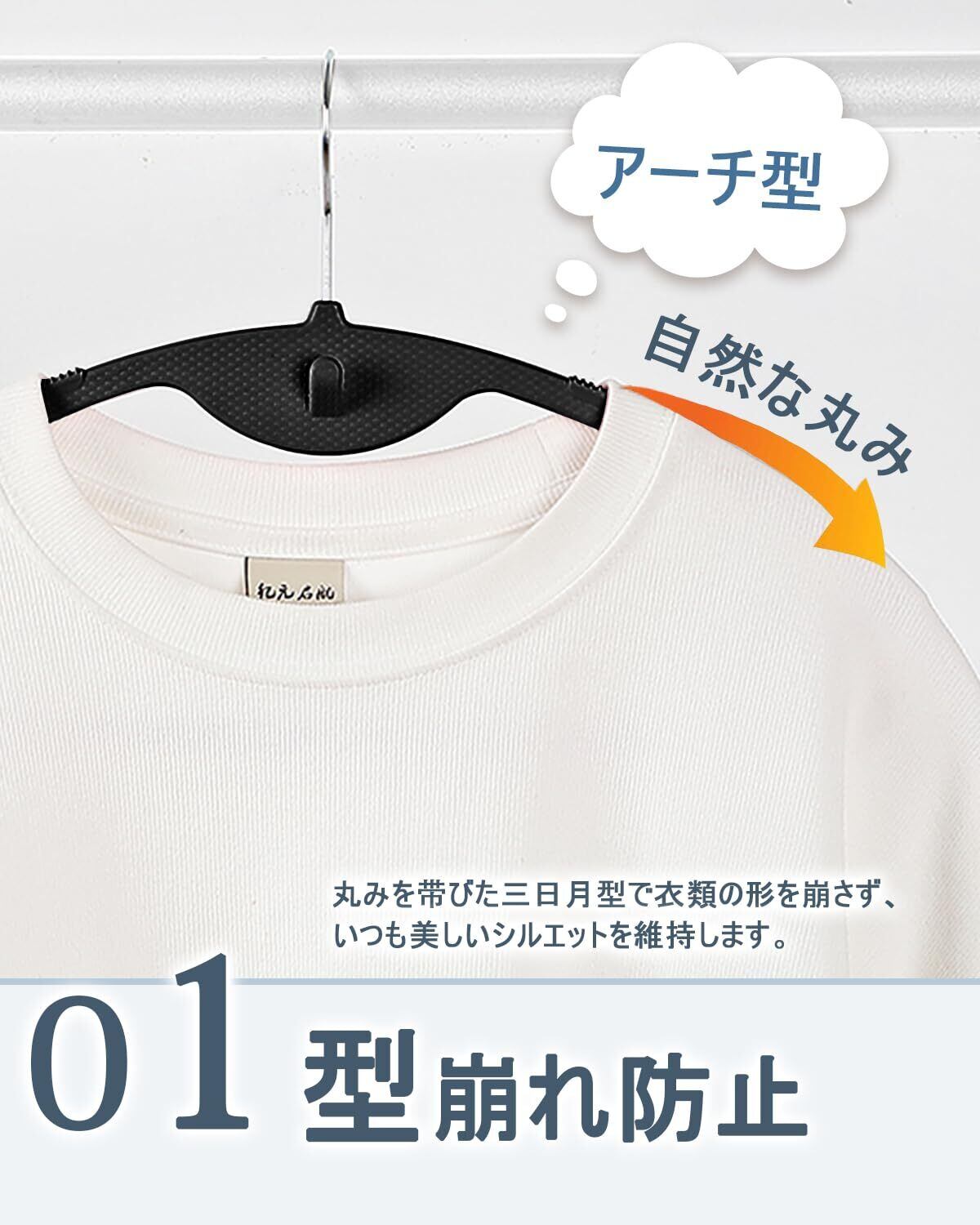 【滑らないハンガー】ラバー加工で衣類をしっかりキャッチします。サテンやシルクなど滑りやすい素材の衣類もしっかりと掛かりやすい仕様です。特殊なPET加工により、軽量でありながら丈夫で、変形しにくく、長期間使用可能です。優れた耐荷重性を持ち、コートやジャケットなどの重い衣類にも対応できます。