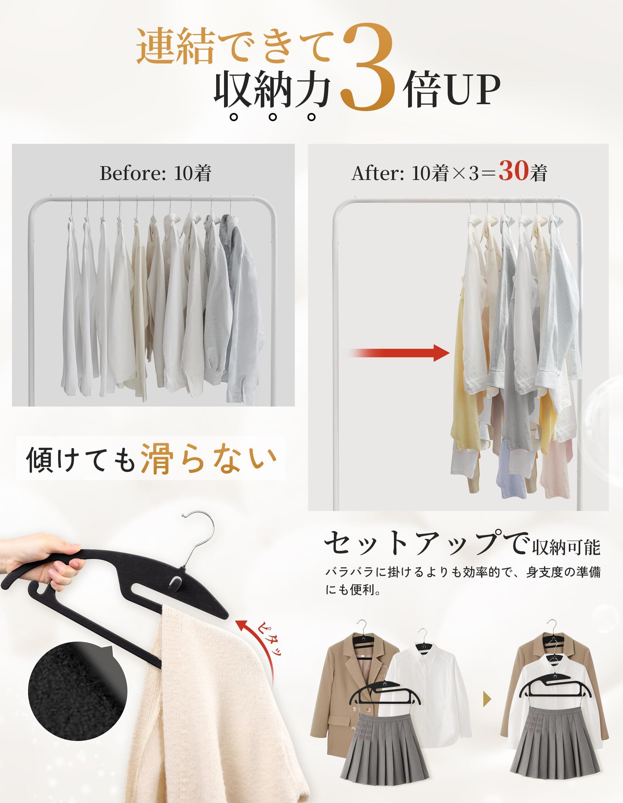 ハンガーの上部には連結フックが付いており、複数のハンガーを繋いで、限られたスペースでも無駄なく収納可能です。クローゼットをすっきりさせ、使いやすさをアップさせます。