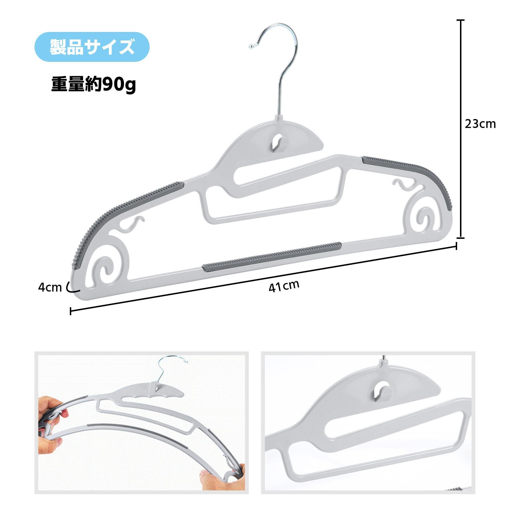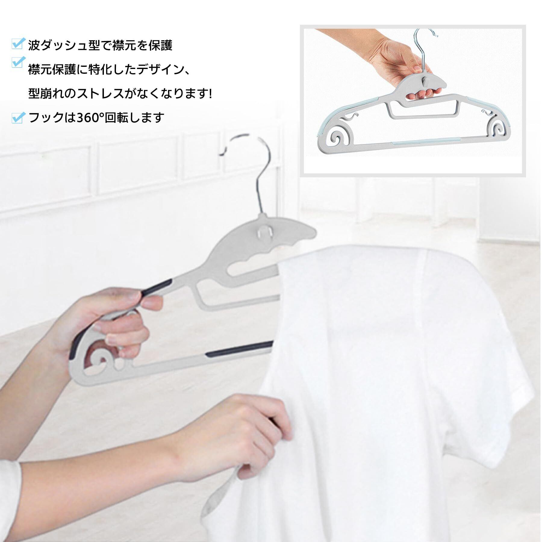 【滑り止め設計】 ハンガーの肩部分には波模様や粒子、摩擦を効果的に高めて滑りを防止します。シルクやシフォンなどの滑りやすい衣類を掛けてもしっかりフィットし、落ちたり型崩れしたりを防ぎます。