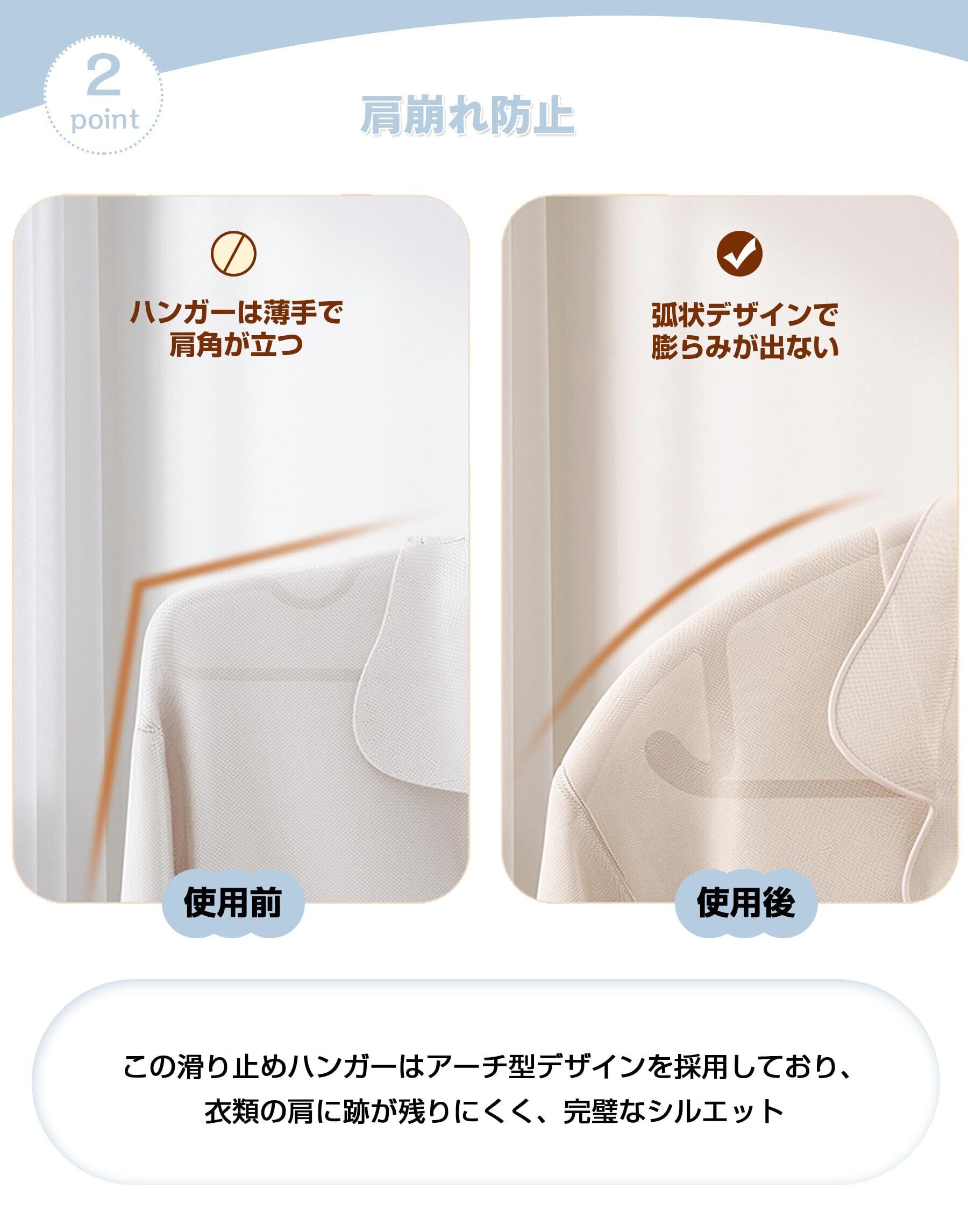 【肩崩れ防止】この滑り止めハンガーはアーチ型デザインを採用しており、衣類の肩に跡が残りにくく、完璧なシルエットを保ちます。様々なニーズに対応できる万能ハンガーです。