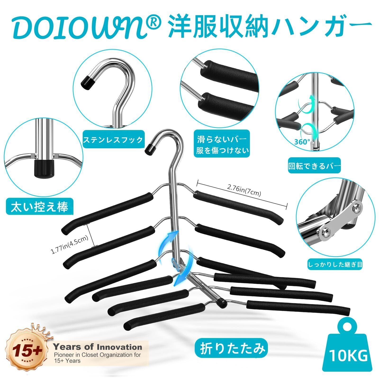 「DOIOWN シャツハンガー」は、省スペース設計、滑らない素材、跡が付かないデザイン、折り畳み可能な便利さ、男女兼用で幅広く使用できる汎用性など、多彩な利点が揃っています。効率的に衣類を整理し、快適な暮らしをサポートします。