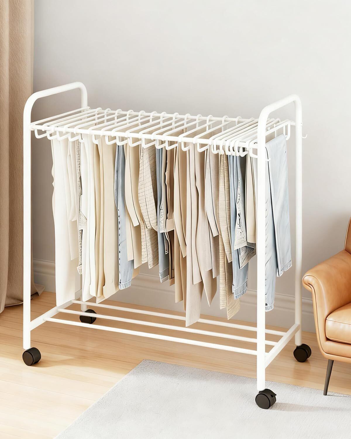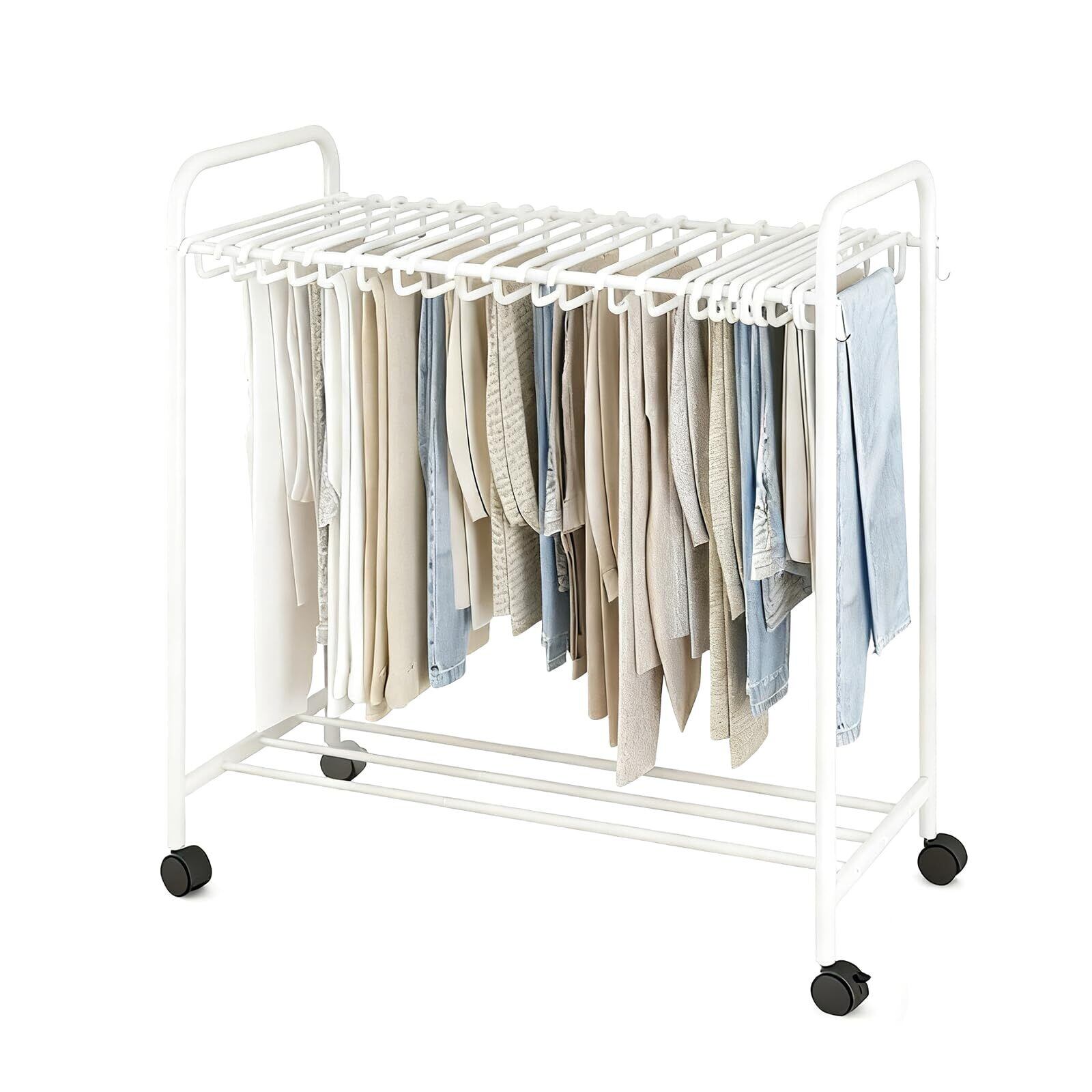 【大容量省スペース】2段式設計で、パンツハンガーの上部には24個のハンガーが付いており、スラックス、スポーツパンツ、ヨガパンツ、スカート、ストール、スカーフ、ネクタイなど様々なアイテムを整理できます。下部は靴や収納ボックスなどを置くことができます。横側のフックにはバッグなどを掛けられます。様々な物品を収納可能で、大容量の収納力が日々のニーズを楽々と満たします。