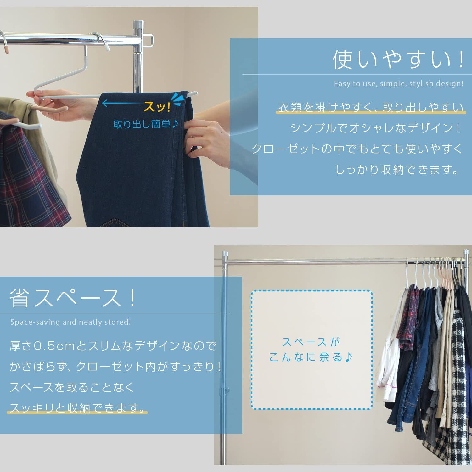 コンパクトでスリムな形状のハンガーは、クローゼットのスペースを有効活用できます。使わないときは重ねて収納可能で、スッキリとした部屋を実現します!