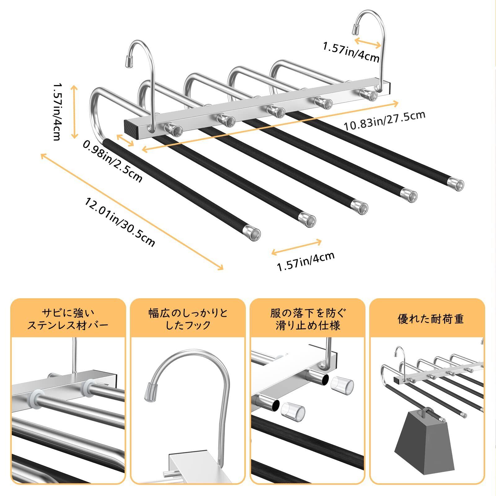 「上質な素材を採用」 パンツハンガー本体は高級感の溢れるスタイリッシュでおしゃれな印象を演出できる錆びることがないステンレス材を採用しており、掛けた服の落下を防ぐ5つの滑り止め仕様のPPパッドがバーの先端に付いており、安定性を高めて、ズボンをより安定に掛けられます。