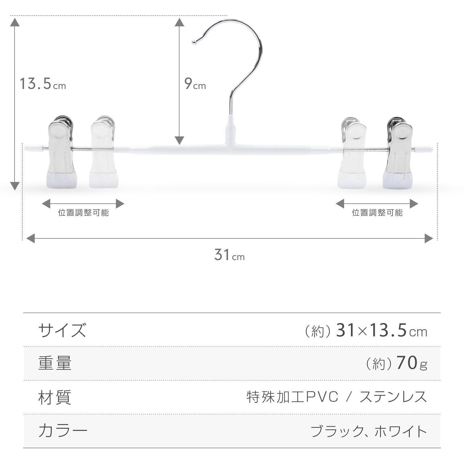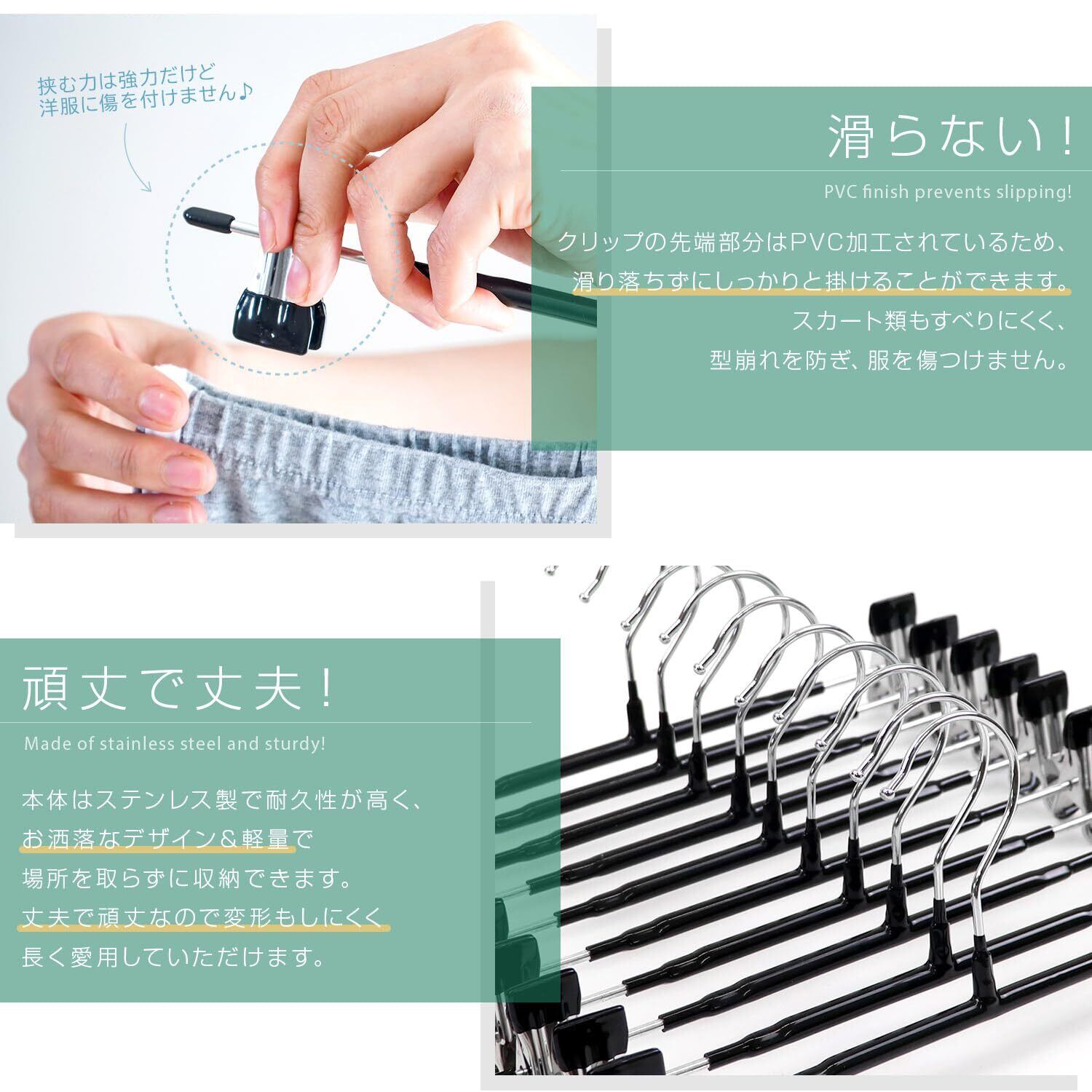 【PVC加工ですべりにくい!】クリップの先端部分はPVCコーティング加工されているため、滑り落ちずにしっかりと掛けることができます。スカート類もすべりにくく、型崩れを防ぎ、服を傷つけません。