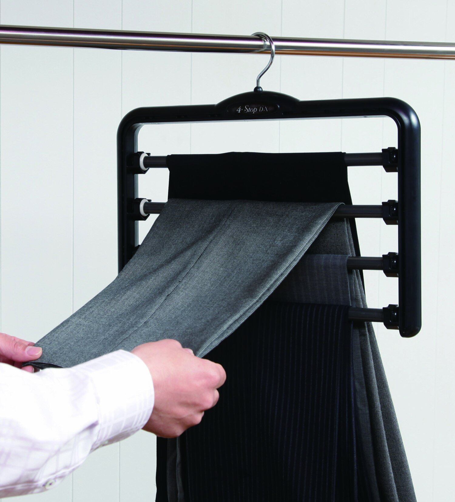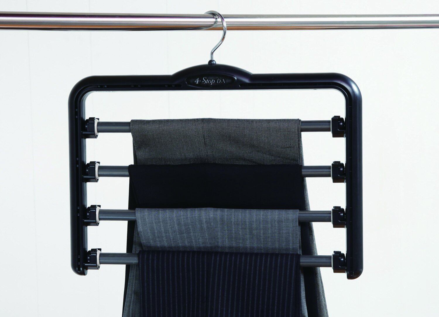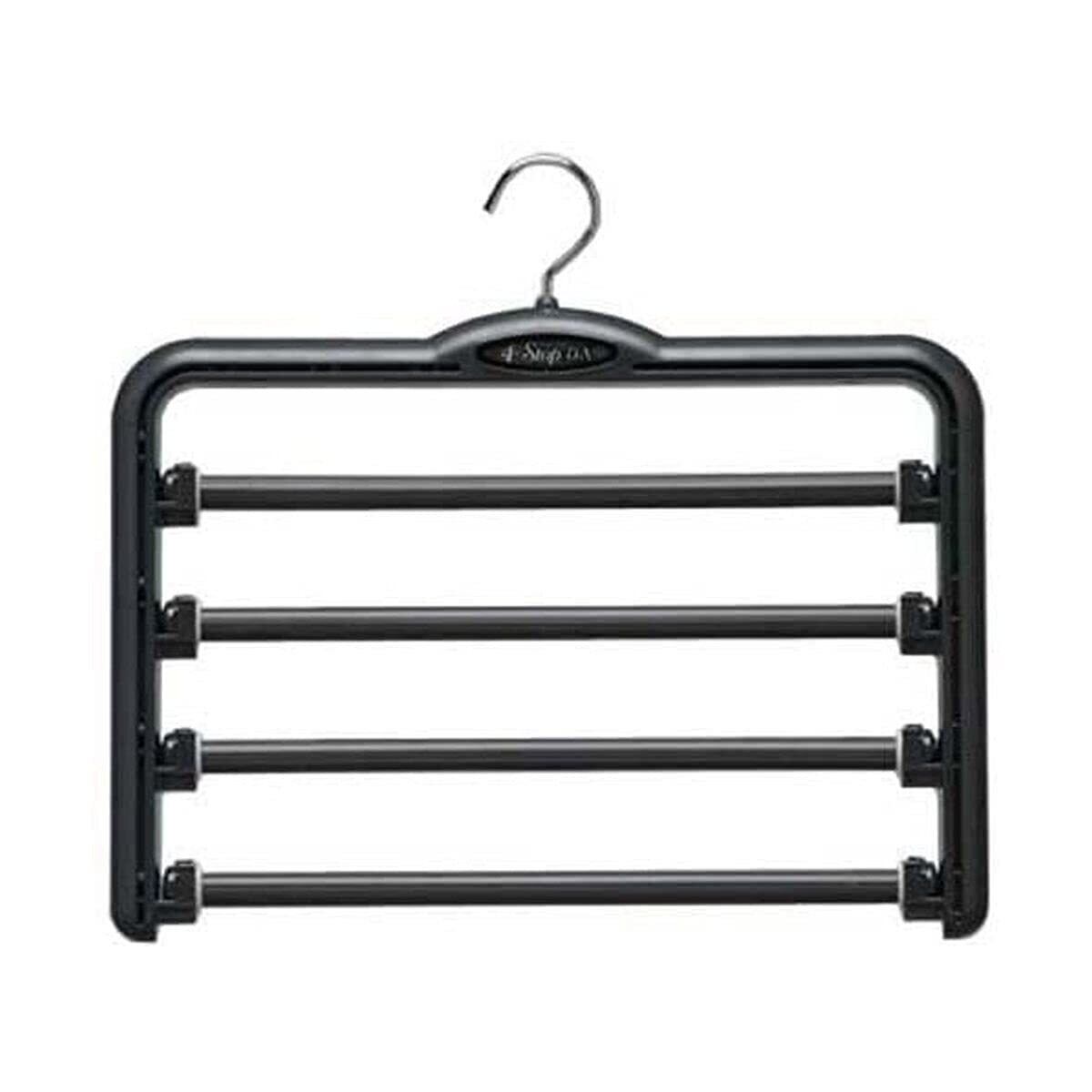 「シンコハンガー フォーストップDX ブラック」は、ブラックの洗練されたデザインで、クローゼットにシックな雰囲気を加えます。ズボンやスラックスはもちろん、スカートやその他のボトムスも一箇所に収納でき、整理整頓が簡単です。