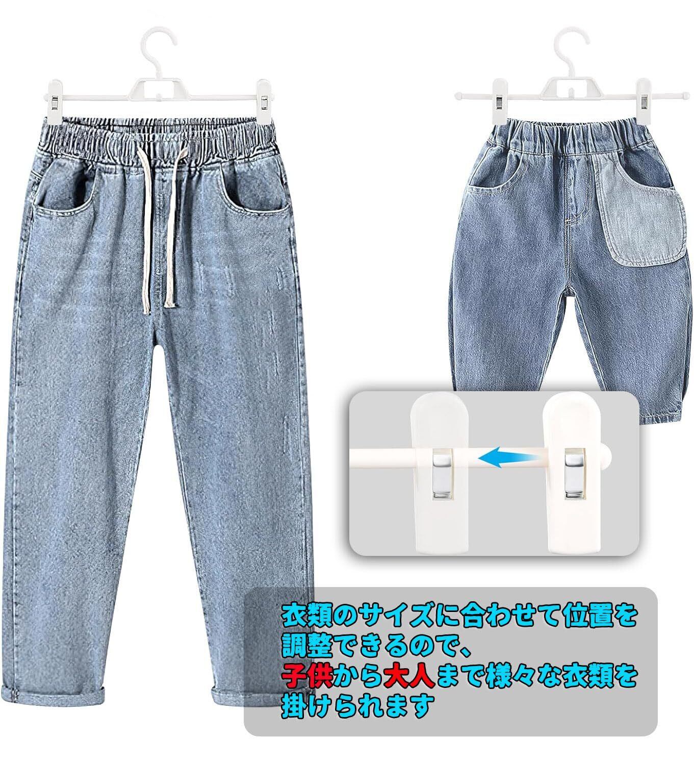 クリップのサイズ調整ができるため、様々なスタイルのズボンやスカートに対応します。男性用、女性用、子供用の衣類まで幅広く使えるのが魅力です。