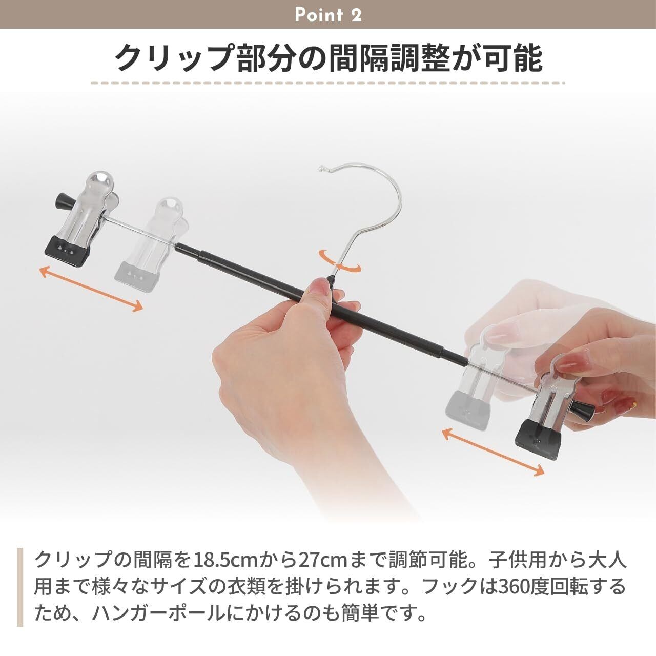 【サイズ調節可能】クリップ部分の間隔を18.5cmから27cmまで移動可能のスカートハンガーです。衣類のサイズに合わせて位置を調整できるので、子供から大人まで様々な種類の衣類を掛けられます。 ハンガーサイズ:幅31cm x 高さ(フックの先からクリップ下端まで) 13cm x 厚み(クリップ部分) 2.5cm。重さ:約44g