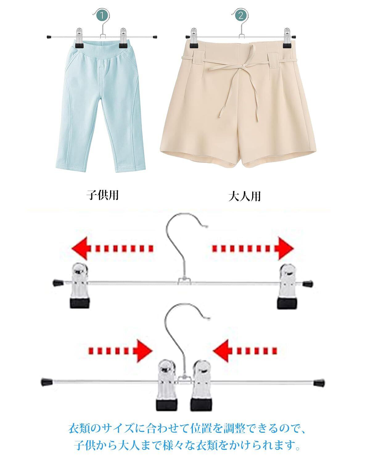 【可動式クリップで位置調整可能】クリップ部分の間隔が左右に5cmから20cmまで移動可能です。衣類のサイズに合わせて位置を調整できるので、子供から大人まで様々な衣類をかけられます。【ショップサービス】 本製品は長期使用が可能です。万が一商品に不具合がある場合は、お気軽にご連絡ください。できるだけ早く解決いたします。