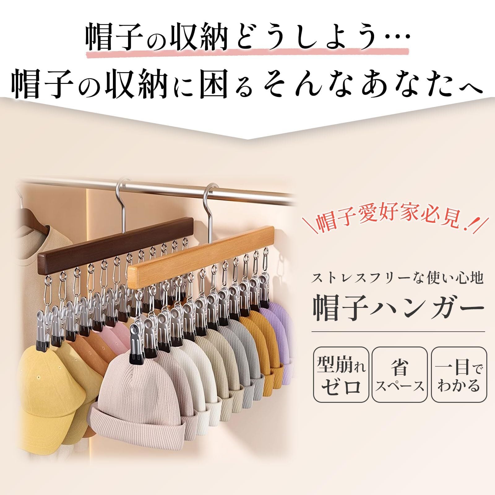 特別に設計されたクリップは、帽子をしっかりとホールドしつつ、傷つける心配もありません。出し入れもスムーズで、忙しい朝の準備に最適です。必要な帽子をすぐに見つけられ、ストレスフリーにおしゃれを楽しめます。