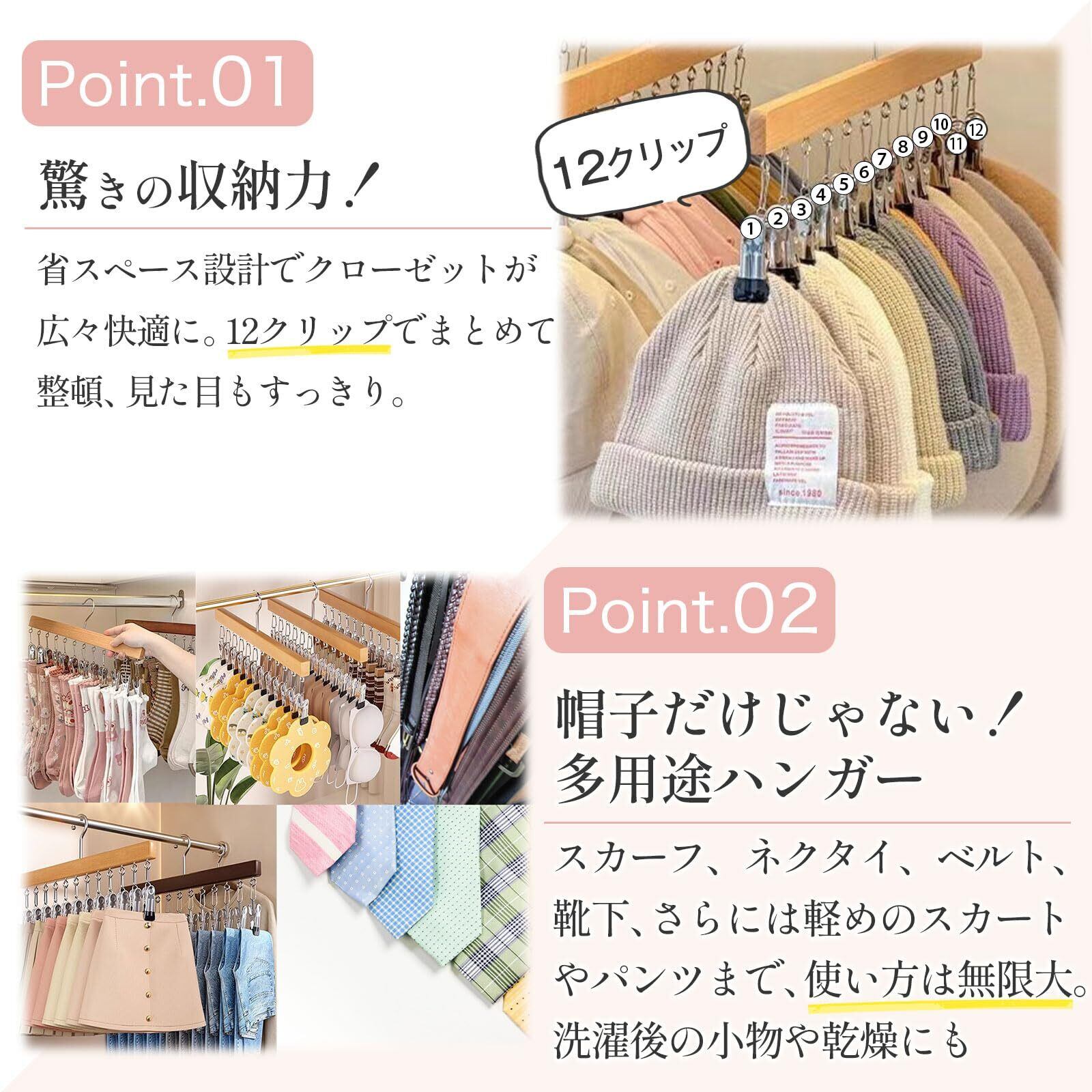 【収納力抜群の12クリップ】12個の取り外し可能クリップ付きで、キャップや衣類を一括収納。クローゼットのスペースを有効活用し、型崩れ防止と整理整頓を同時に叶えます。