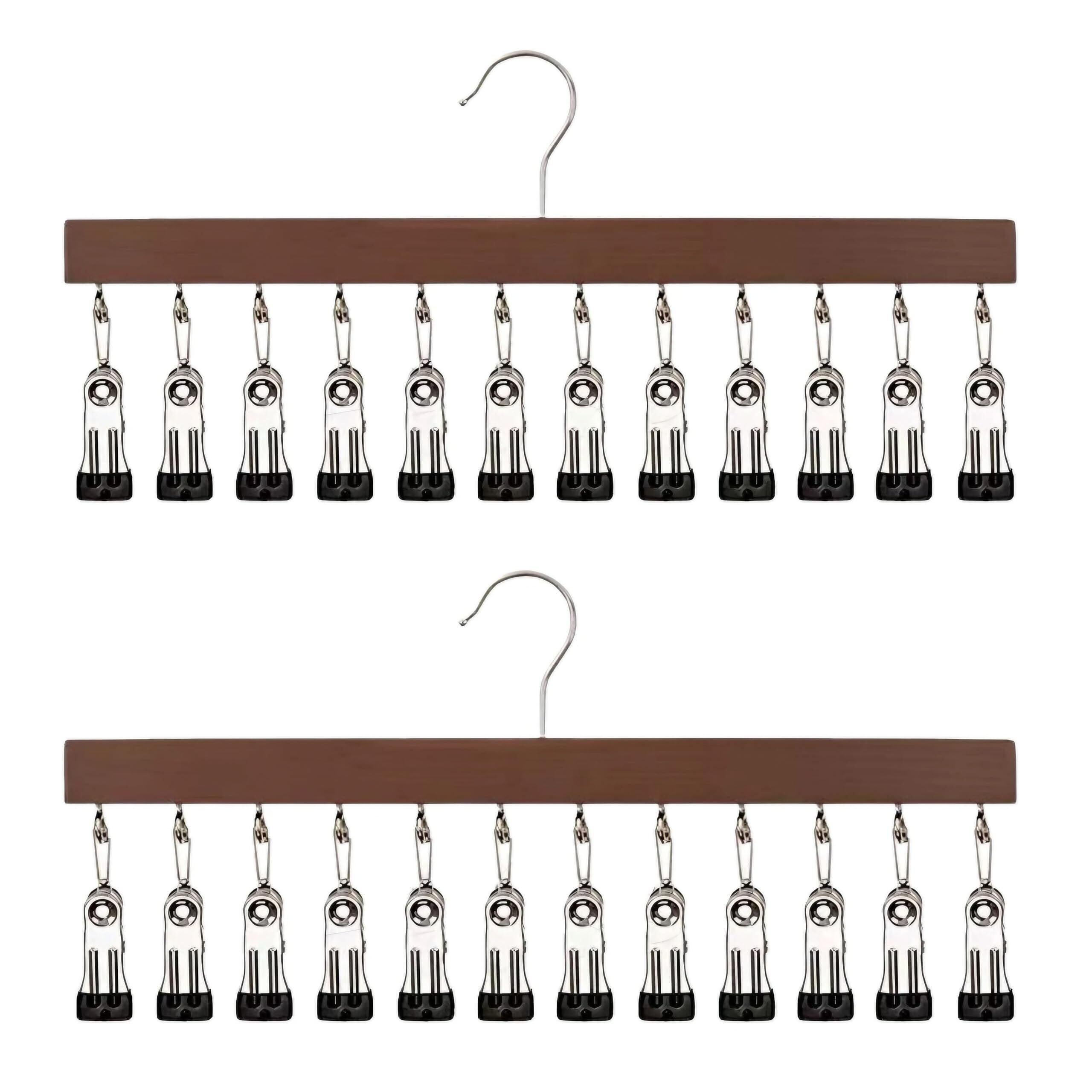 【省スペースで衣類も小物もすっきり収納】 靴下・下着・タオル・帽子など、毎日使う小物類をまとめて吊るせる12連クリップ式の木製ハンガー。限られたクローゼットの空間や物干しスペースを有効活用できます。洗濯から収納まで一連の動作を効率化したい主婦層や一人暮らしの方にぴったりです。