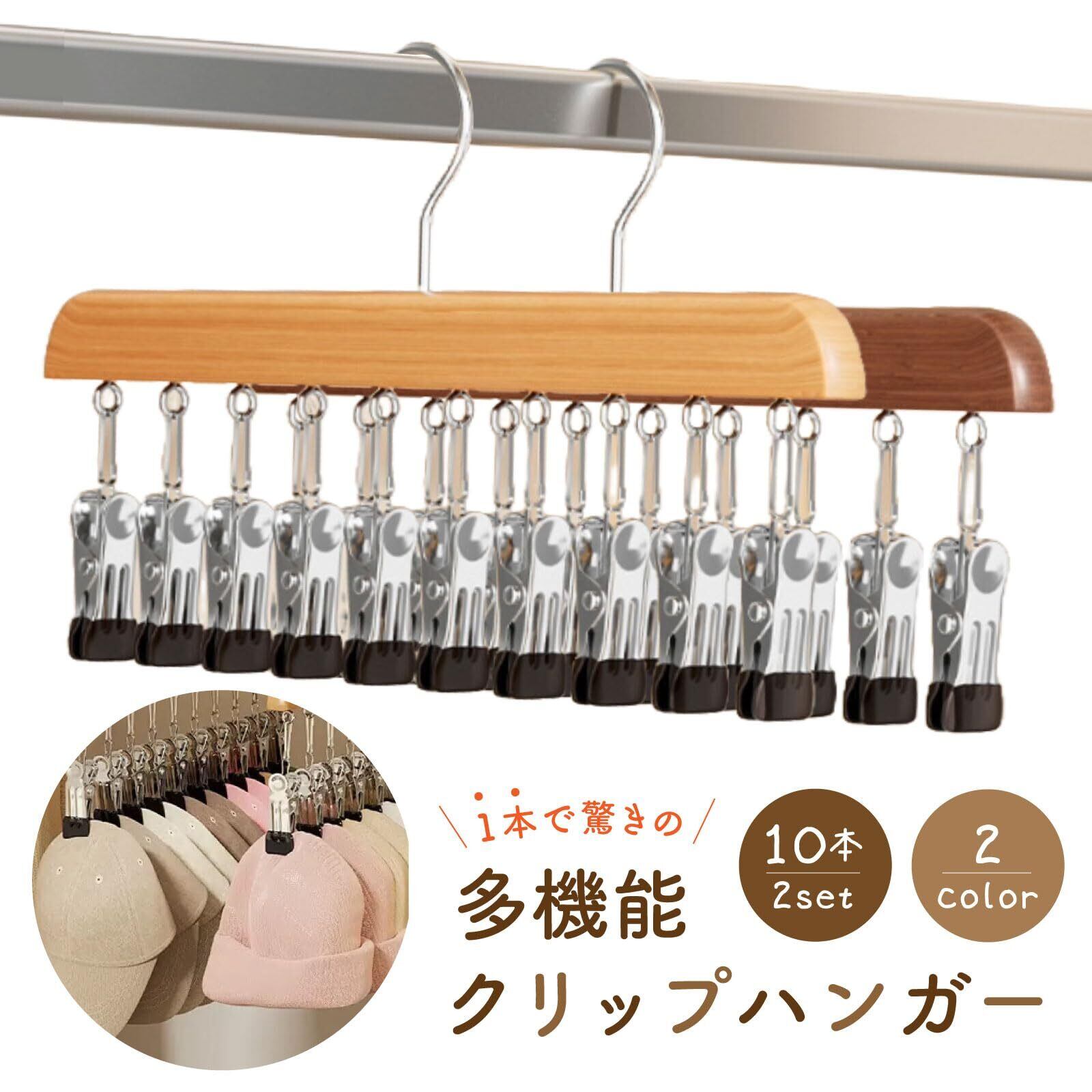 クリップハンガーは、これ一本で10個の帽子収納ができる便利な多機能ハンガー。キャップ、ニット帽はもちろん、靴下、下着、ハンドタオルなどのファッション小物の収納に便利。インテリアに合わせやすいブラウン系2色展開、2個セット。