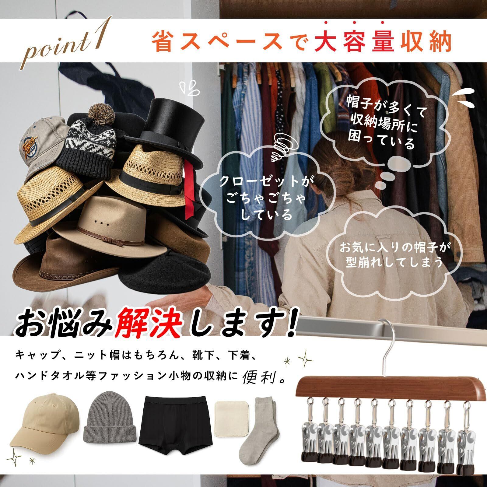 このハンガーは、帽子だけでなく靴下やその他の小物を収納するのにも最適です。多機能性を活かしておしゃれに整理できるため、機能的でありながら飾る楽しみも実感できる商品です。