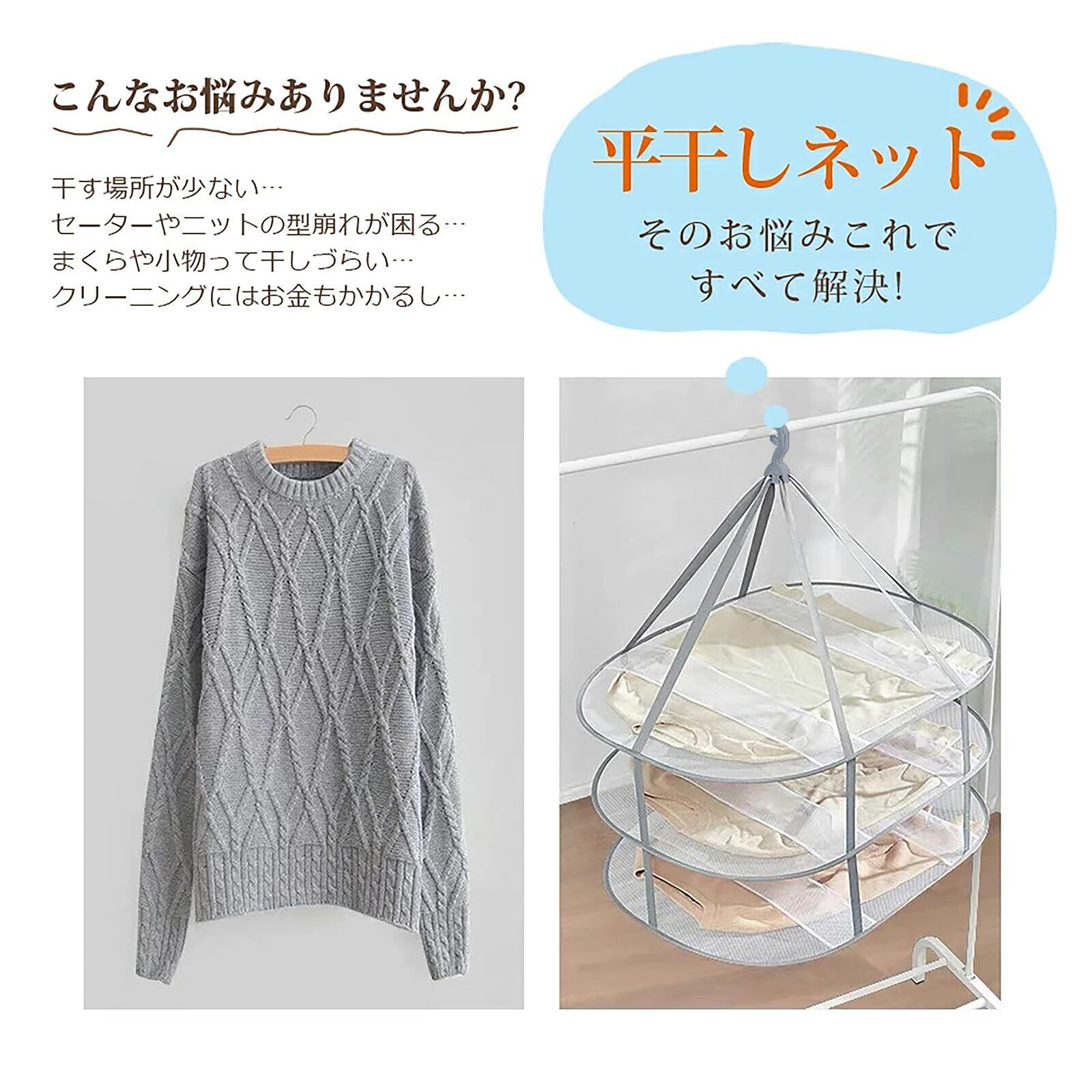 「平干しネット 3段」は、衣類をしっかり保護し、型崩れを気にせずに干すことができる便利なアイテムです。ぜひ一度お試しください!