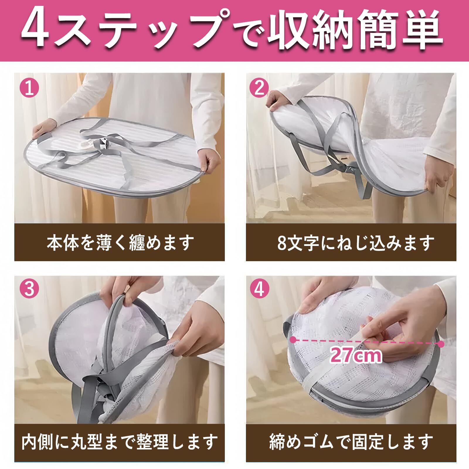 【コンパクトに収納】物干しネットがコンパクトに折りたためるので、使わないときはバンドや収納ポーチに入れて楽々に収納できます。平干しネットを頻繁に使わない人や収納場所がない人におすすめです。折りたたむと直径27cmまでコンパクトにでき、小さなスペースに収納可能です。旅行や出張で使いたい人にもピッタリです。バンドで固定できるものや収納ポーチがついたものなら、不意に開いてしまうこともありません。