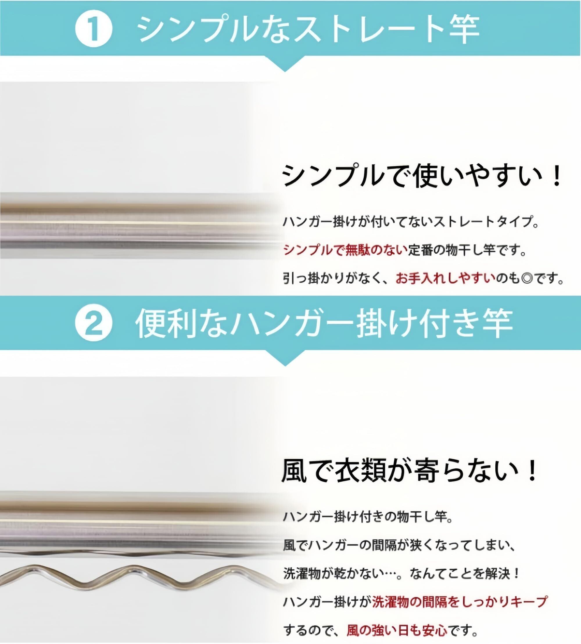 【2種類の物干し竿】:1、シンプルなストレート竿。シンプルで使いやすい! ハンガー掛けが付いてないストレートタイプ。シンプルで無駄のない定番の物干し竿です。引っ掛かりがなく、お手入れしやすいのもです。2、 便利なハンガー掛け付き竿。ハンガー掛け付きの物干し竿。 ハンガー掛けが洗濯物の間隔をしっかりキープ するので、洗濯物が風で移動せず 風通しを確保し、乾きやすい、風の強い日も安心です。