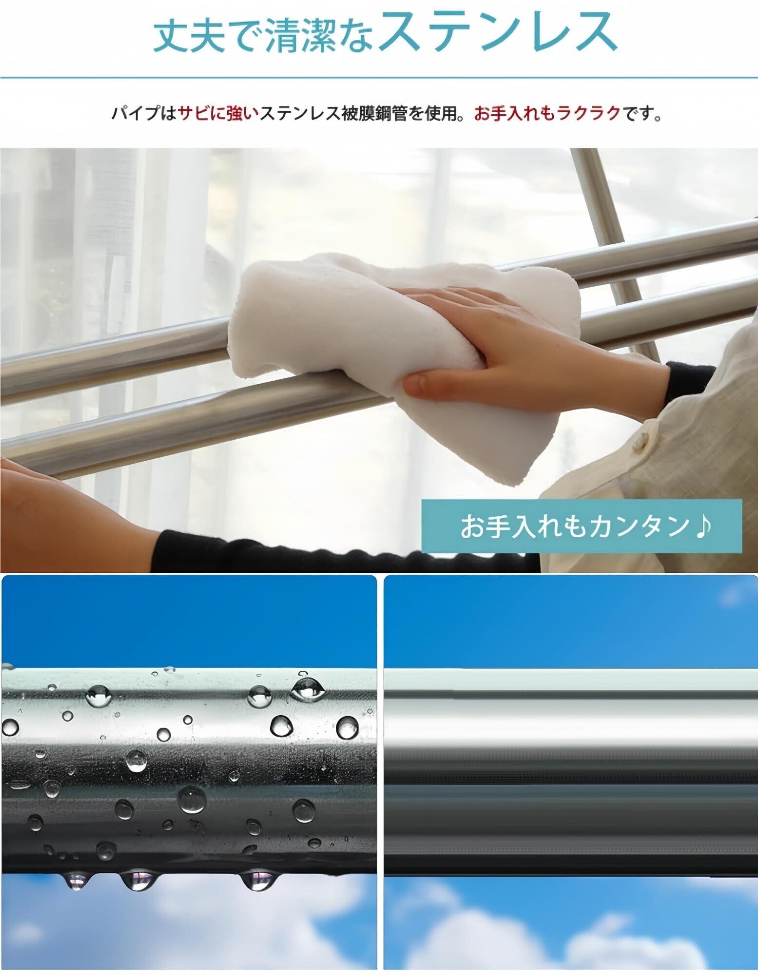 高品質なステンレス素材を使用しており、錆に強くて長持ちします。外部環境にもしっかり耐え、雨の日でも安心して使用できる設計です。耐荷重はなんと10kgで、様々な洗濯物をしっかり支えます。