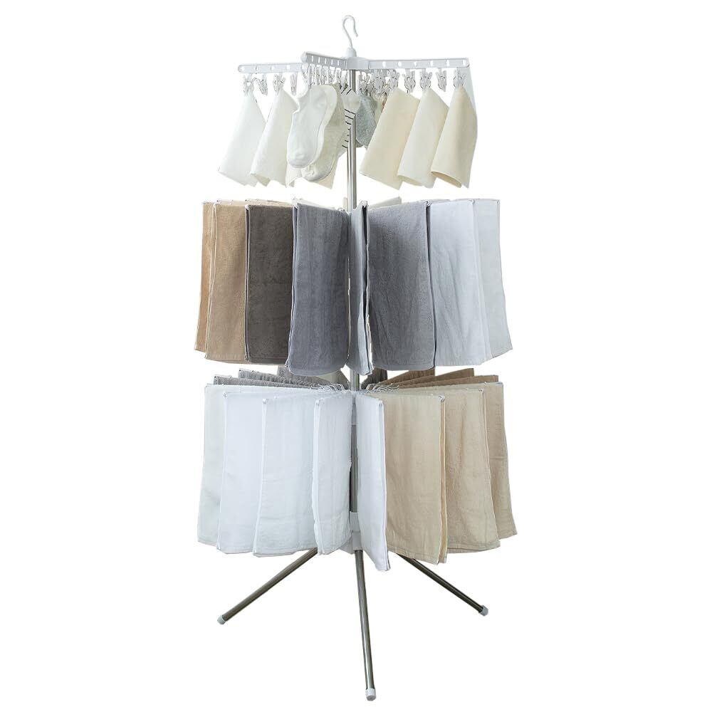 直径約84cmの3段式のデザインにより、狭いスペースでもしっかり洗濯物を干せます。使用しない時は、折りたたんでスリムに収納できるため、限られた家庭のスペースを有効活用したい方に最適です。