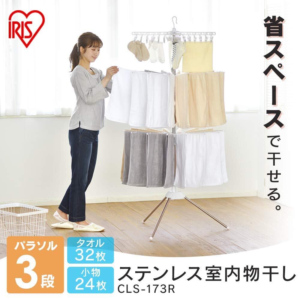 \【◆アイリスオーヤマ 高さ調節ができてピンチハンガーとしても使用可能なパラソル洗濯物干し 3段 直径約84cm CLS-173R】/
