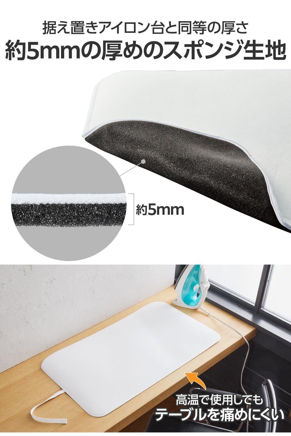 ■据え置きアイロン台と同等の約5mmと厚めのスポンジ生地を採用。抜群のかけ心地と断熱性能を発揮するため、アイロンを高温で使用してもテーブルを痛めにくいです。