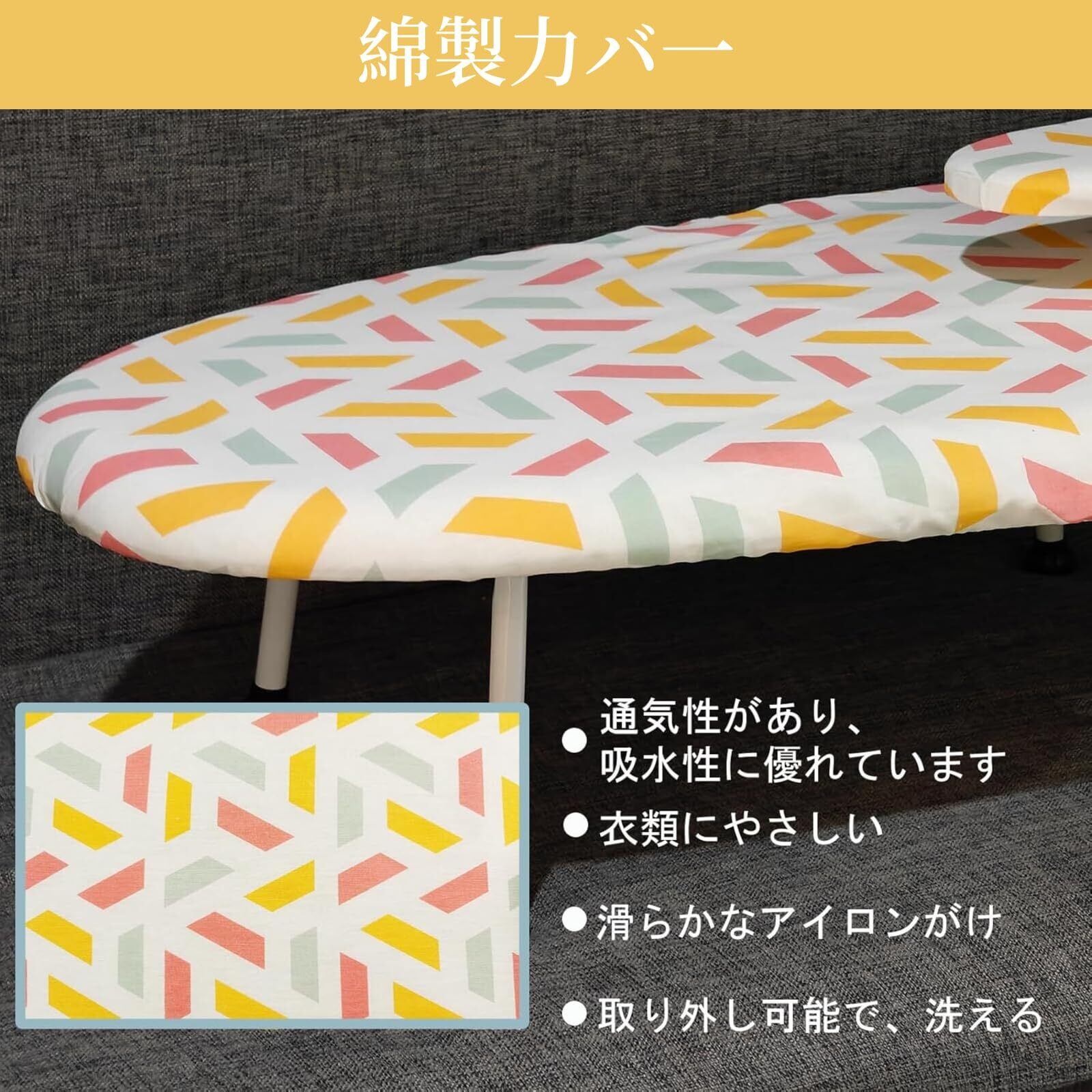五彩の台形デザインが目を引くこのアイロン台は、見た目にも楽しさを与えてくれます。日常のアイロン作業をもっと楽しくしてくれるアイテムです。