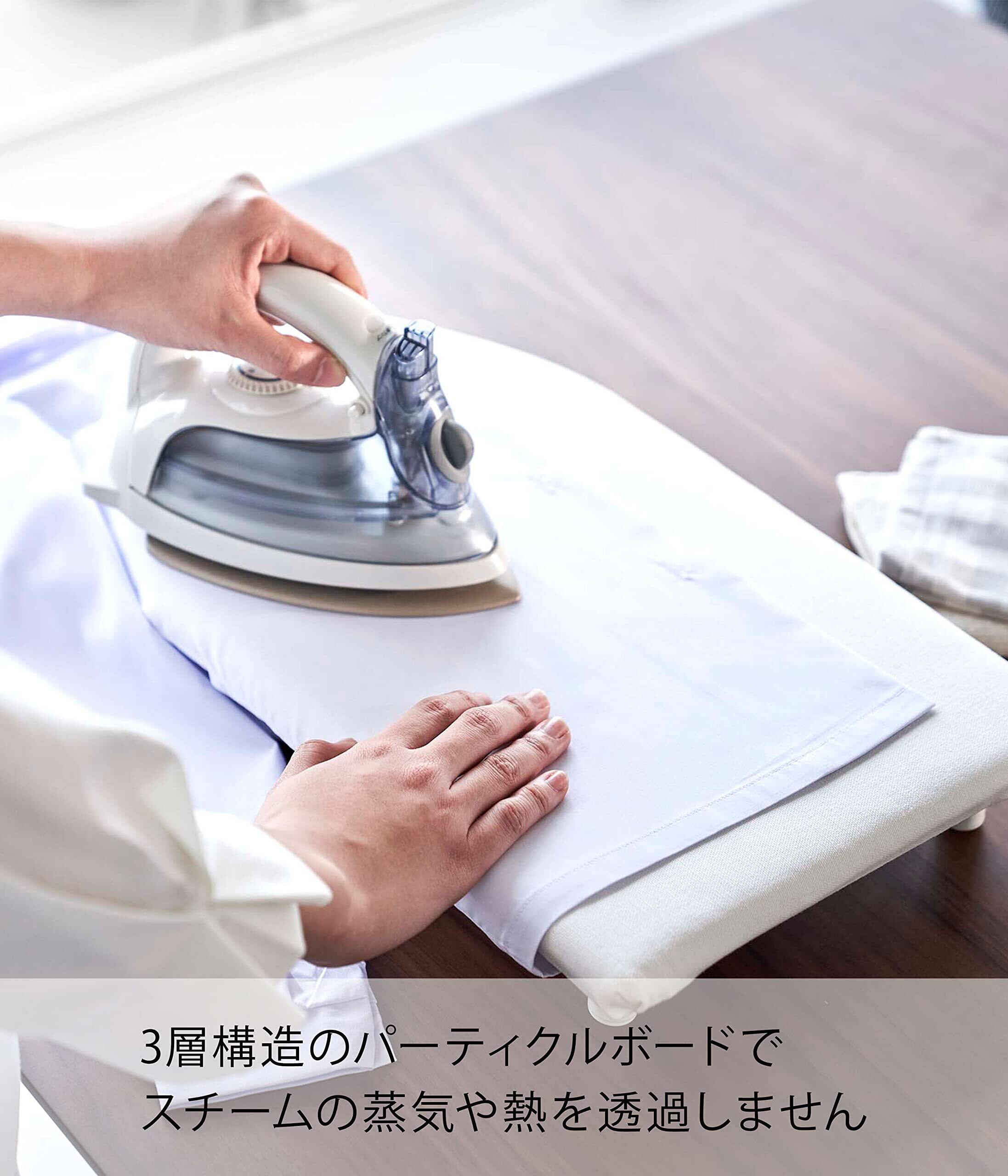 卓上でスチームアイロンが快適に掛けられる、すべらない脚付きアイロン台。3層構造のパーティクルボードだから、スチームの蒸気や熱を透過せず、テーブルを傷めません。キャップは接地面が丸いため、がたつかずシリコーンで滑りません。衣類をアイロン台の下に滑り込ませられるので、立体的にアイロン掛けができます。Sサイズは、お子様のシャツなどもアイロン掛けしやすい大きさ。コンパクトで置き場所に困りません。