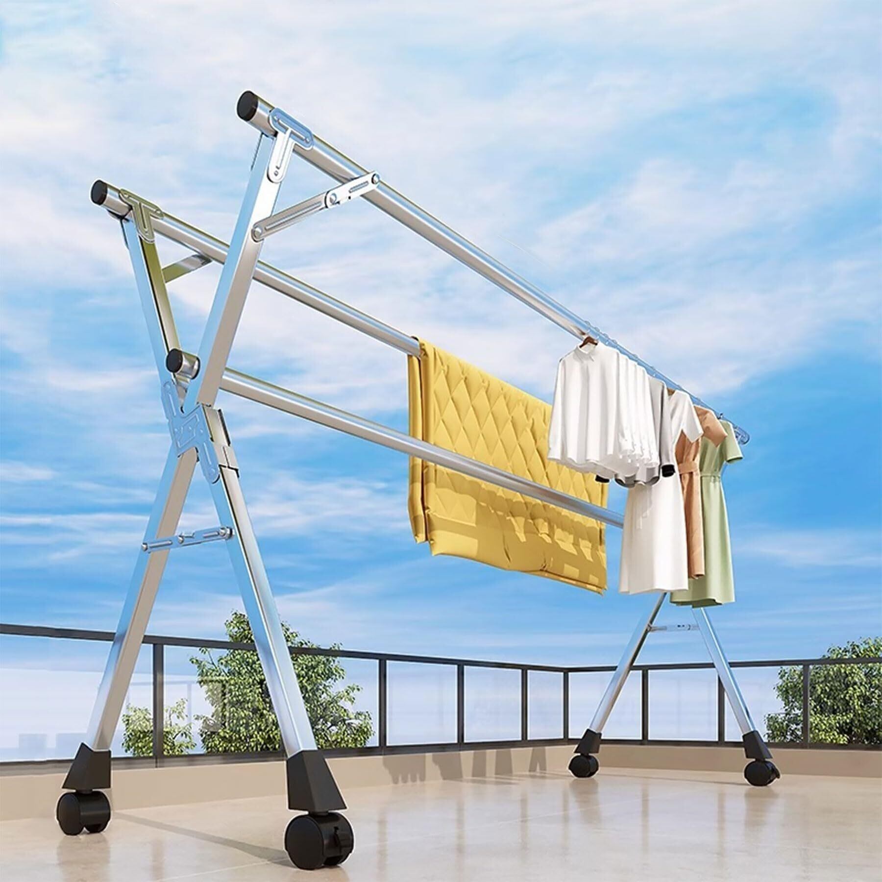 【多機能】耐摩耗性と滑り止めの2つの機能を備えています。キャスター付き、平らなタイル、フローリング、凹凸のある芝生などの路面でもしっかりと支え、転倒や揺れを効果的に防ぎます。収納容量も大きくなり、バルコニー干しから屋外干しまで常に安定感があります。