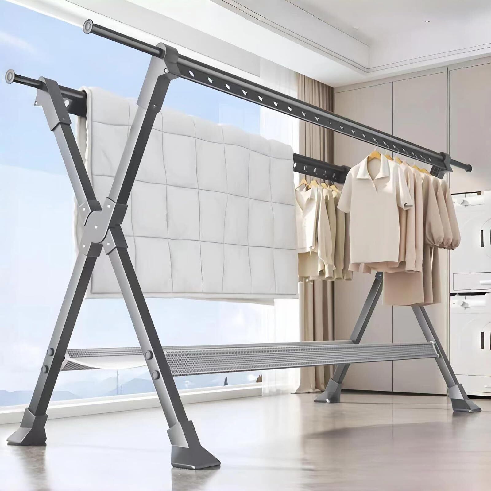 X型デザインと広いベースで安定性が向上。風の強い日でも、ネット付きでしっかりと洗濯物を保持しますので、安心して使用できます。風の影響を受けにくく、快適に干すことが可能です。