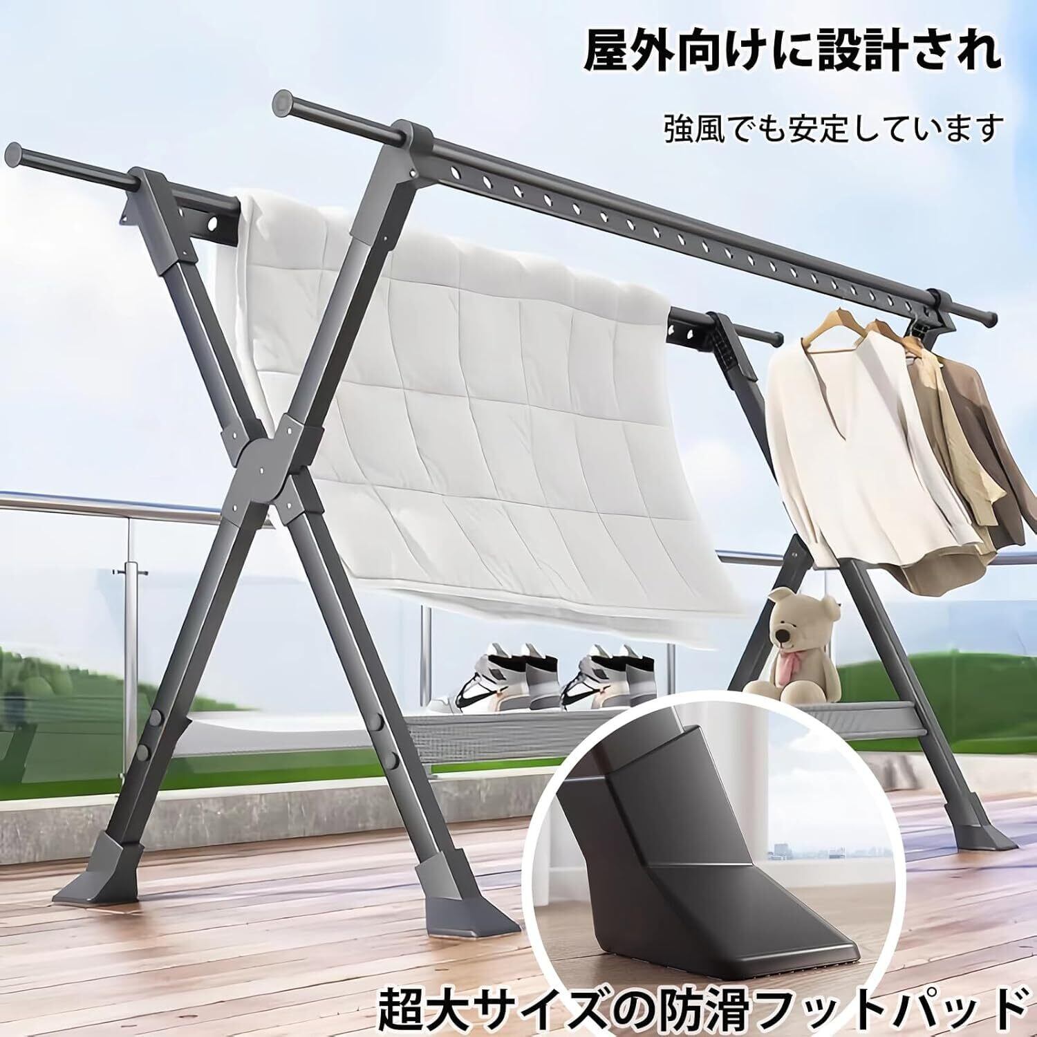 【 耐久性と防錆性能】高品質なステンレス素材を使用したこの洗濯物干しは、耐久性があり錆びにくい特性を持っています。8cm広げた竿を採用し、屋外での風の安定性をさらに向上させます。屋内外を問わず、安心してご利用いただけます。