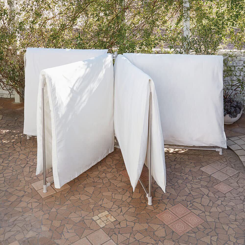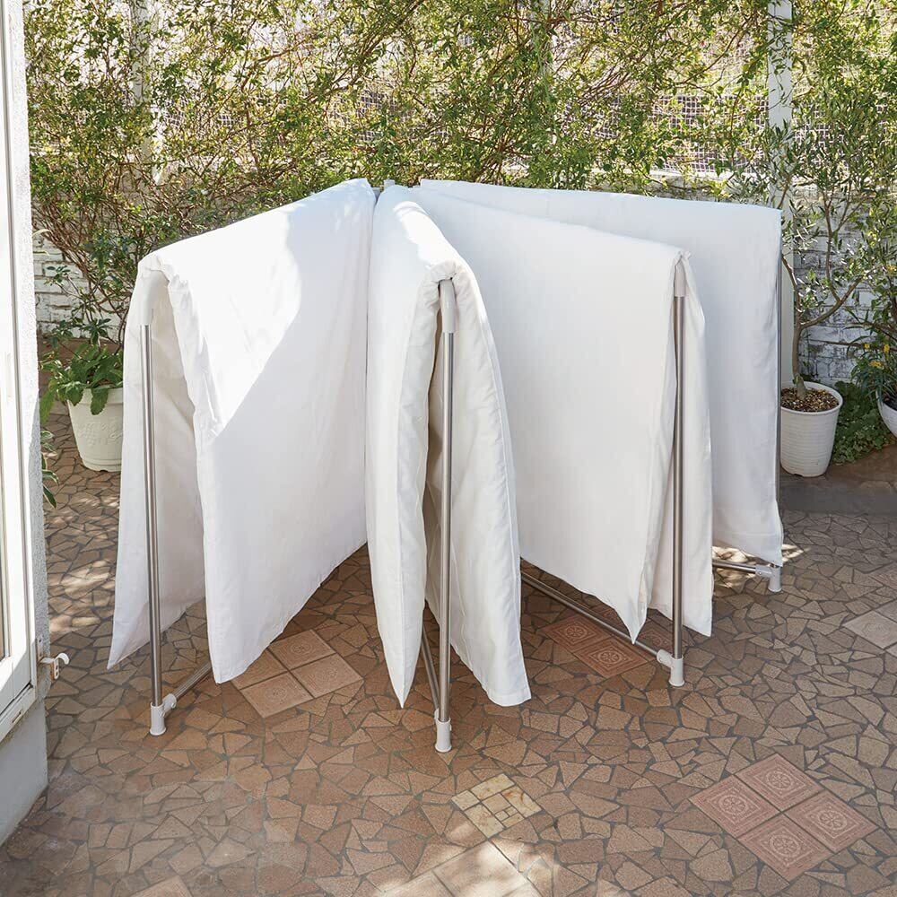 扇形のデザインは、風に対しても安定感があります。他の物干しと比べて、風の強い日でも安心してご利用いただけます。また、布団がしっかりと支えられ、大量の洗濯物も一度に干せます。
