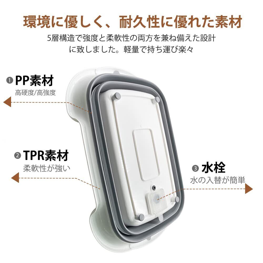 【高品質&無毒無害】底部には水抜き栓がついているので、排水時も本体を傾ける必要がなく、簡単に行えます。耐久性に優れていて、水が漏れません。何度も折り畳めても変形しません。底は耐摩耗設計なので、底部の磨損を有効的に減少し長持ち出来ます。環境に優しいPP素材とTPR素材を使用するため、安全を確保できます。