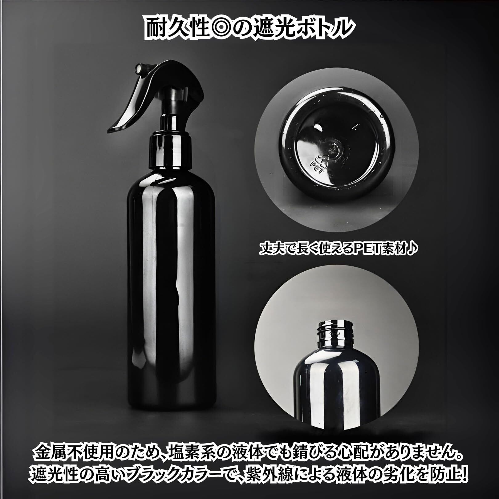 【耐久性◎の遮光ボトル】軽量で耐久性に優れる強化PET素材を採用。金属を使わないオールプラスチック製なので、塩素系の液体でも錆びる心配がありません。遮光性の高いブラックカラーとなっているため、紫外線による液体の劣化を防止できます。