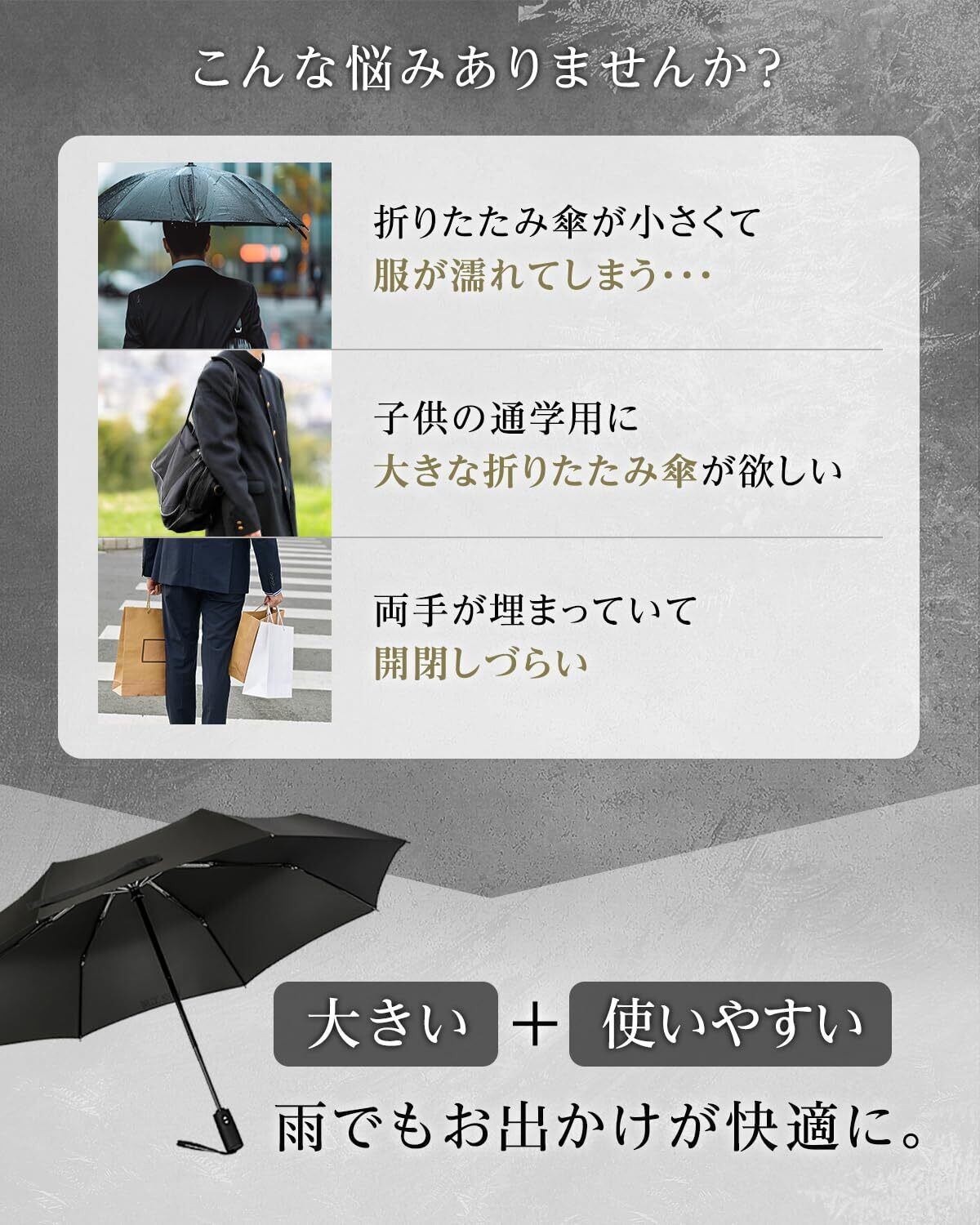 【使いやすさにこだわり】 日本の生活シーンを想定し、「通勤」「通学」「お買い物」とあらゆるシーンで選ばれるような「大きくて濡れにくい」「持ち運びやすい」を両立できるバランスの傘を自動開閉モデルで目指しました。