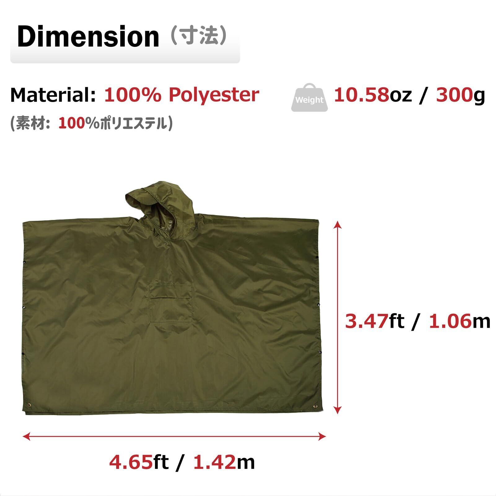 【フリーサイズポンチョ】長さ:106cm、幅:142cm、収納サイズ:14 × 17 (cm)、重量:300g、男女兼用。自転車対応、リュック・バックパックを背負った時も着用できま