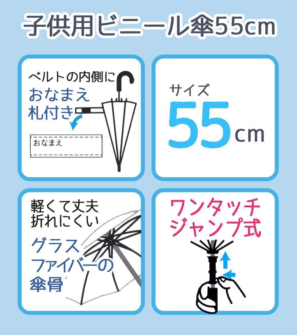 親骨55cmのサイズは、9~10才のお子様にピッタリ。ワンタッチジャンプ式のデザインにより、手間いらずで簡単に開くことができます。小さなお手ても楽に操作できるため、自分で傘を使う楽しさを感じられます。