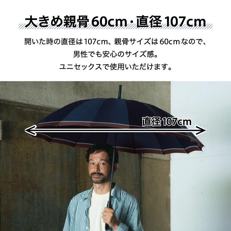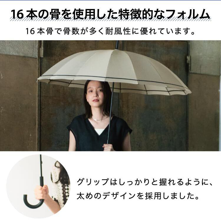 16本骨の頑丈な構造を採用しており、強風時にも安心してお使いいただけます。耐風性に優れているため、突然の突風でも傘が壊れる心配が少なく、ストレスフリーな使用感を実現しました。