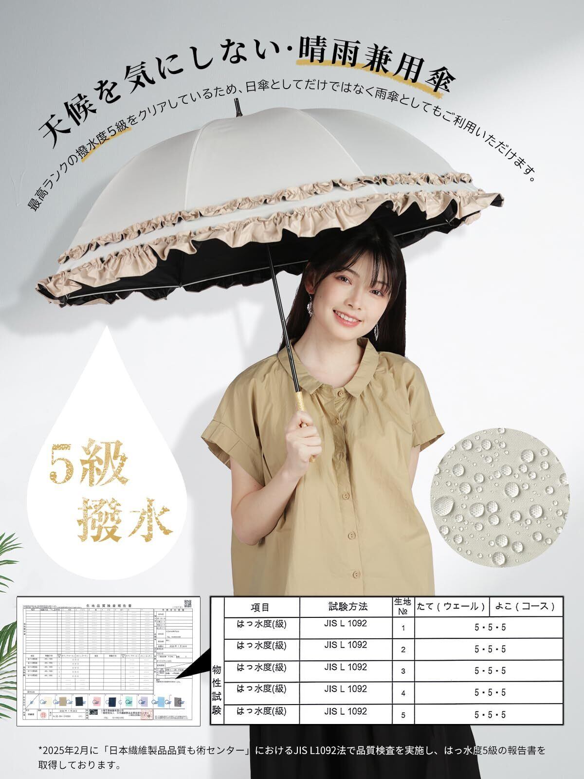 5級撥水加工を施しており、急な雨にも対応可能。この日傘兼用雨傘は、撥水効果が高く、サッと水を弾きます。雨の日でも安心してご使用いただけます。