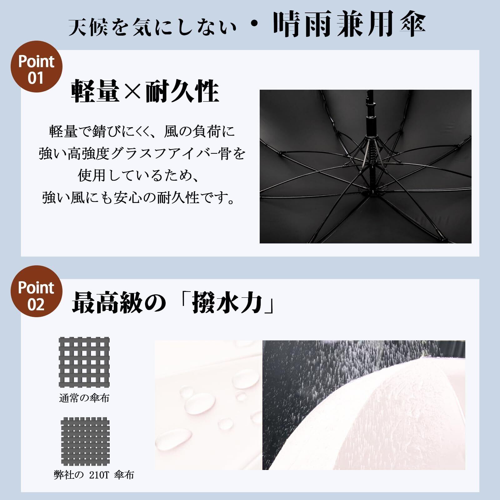 【晴雨兼用日傘*耐风防水】この製品は、紫外線遮蔽・遮光・遮熱効果を目的とした日傘です。高密度の撥水加工材料で作られ、雨が珠のように丸くなり転がり落ちます。また、傘は親骨と中棒が高品質のグラスファイバーで作られ、傘の強度を向上させ、激しい雨でも安心して使用できます。一年中季節問わず使うことができ、梅雨対策にもUV対策にも欠かせない優秀なアイテム!