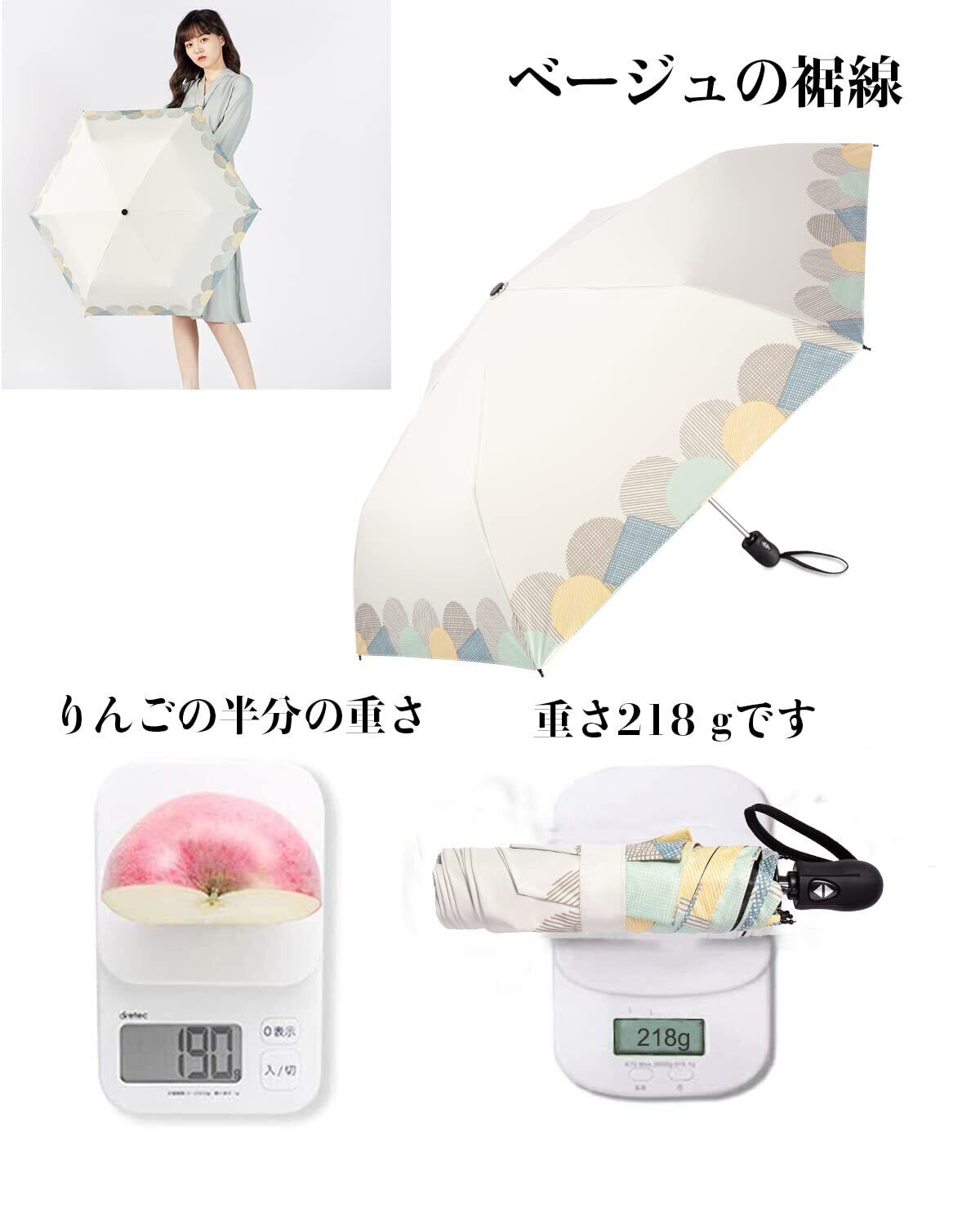 この日傘は、わずか〇〇gの軽量設計で、使用時には直径約〇〇cmの大きさになり、折りたたむとわずか〇〇cmのコンパクトサイズになります。バッグに入れてもかさばらず、通勤や旅行におすすめです。常に携帯しておくと安心です!