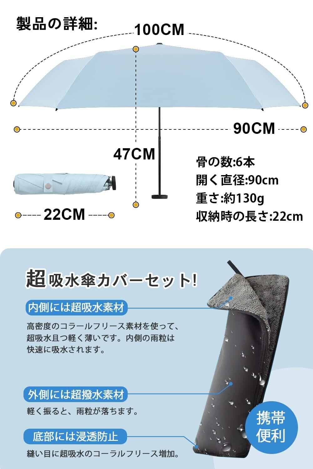 【超撥水】高密度の防水傘布、軽い揺れは水を振り落とすことができます。耐風、撥水、晴雨兼用。