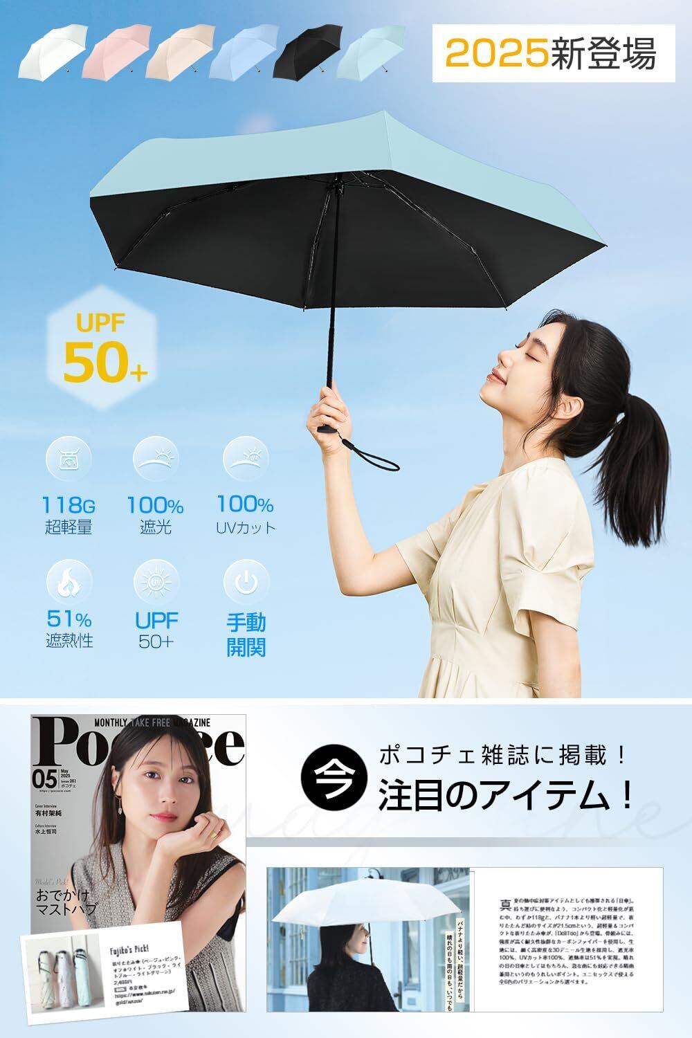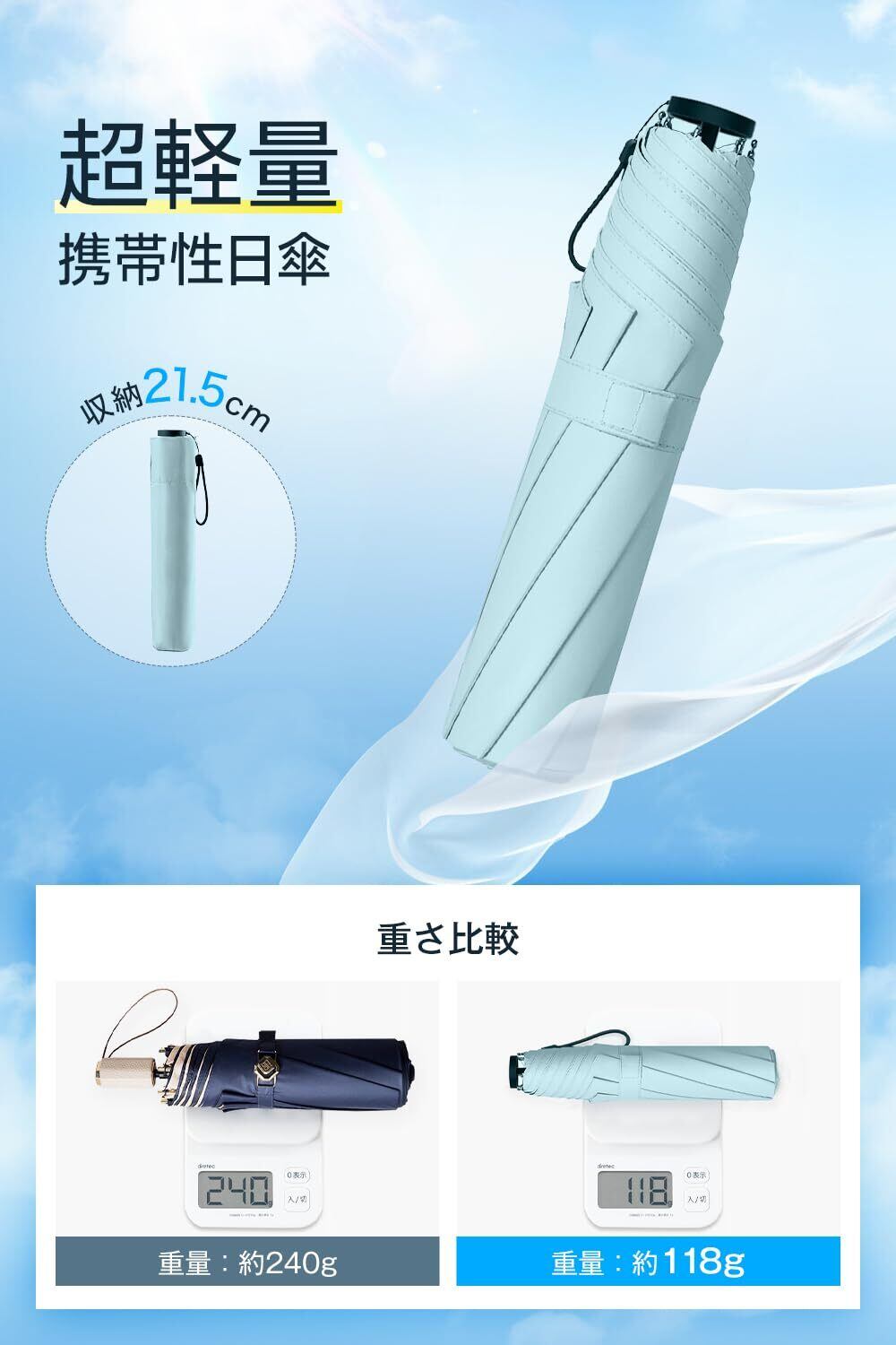 この日傘はわずか118gの軽さを実現。持ち運びがストレスフリーで、バッグの中に入れても負担になりません。日常の通勤や旅行、ピクニックなど、どんな場面でも活躍する便利なアイテムです。