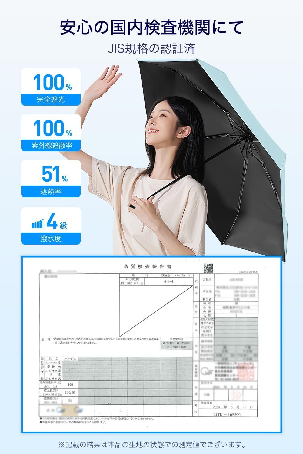 その特別な生地はUVカット率100%を誇り、強い日差しからしっかりとあなたの肌を守ります。JIS認証を受けており、安心してお使いいただける高品質の日傘です。日焼けを気にせずにアウトドアを楽しむことができます。